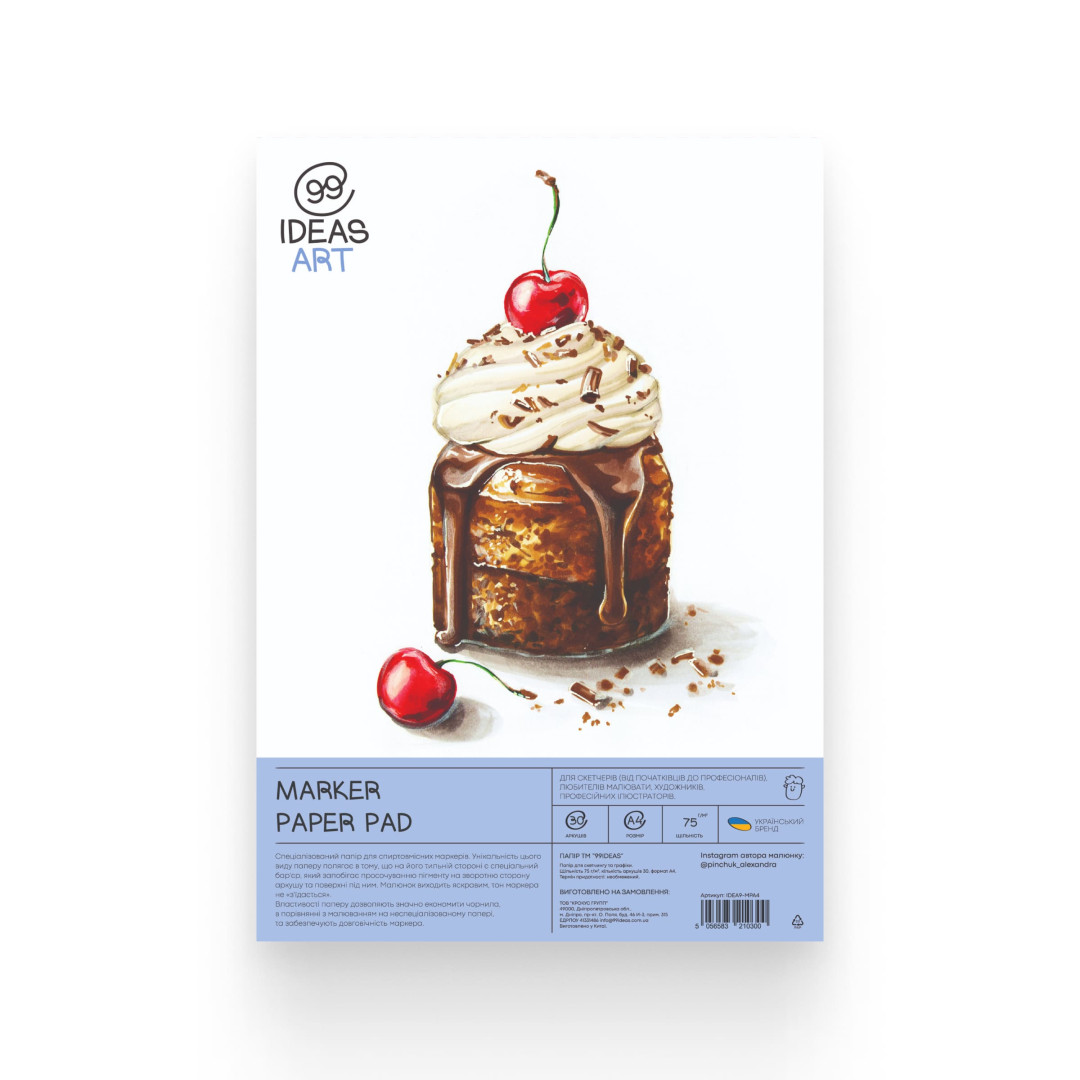 Спеціалізований папір для спиртовмісних маркерів від 99IDEAS. На тильній стороні є спеціальний бар'єр, який запобігає просочуванню пігменту на зворотню сторону аркушу та поверхні під ним. Малюнок виходить яскравим, тон маркера не «з'їдається». Підходить для скетчерів (від новачків до професіоналів), художників, профессійних ілюстраторів, архитекторів та дизайнерів.
