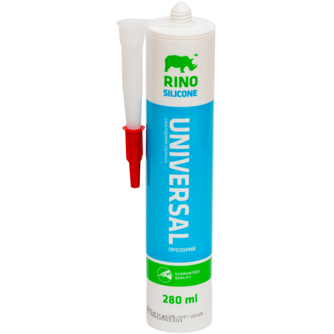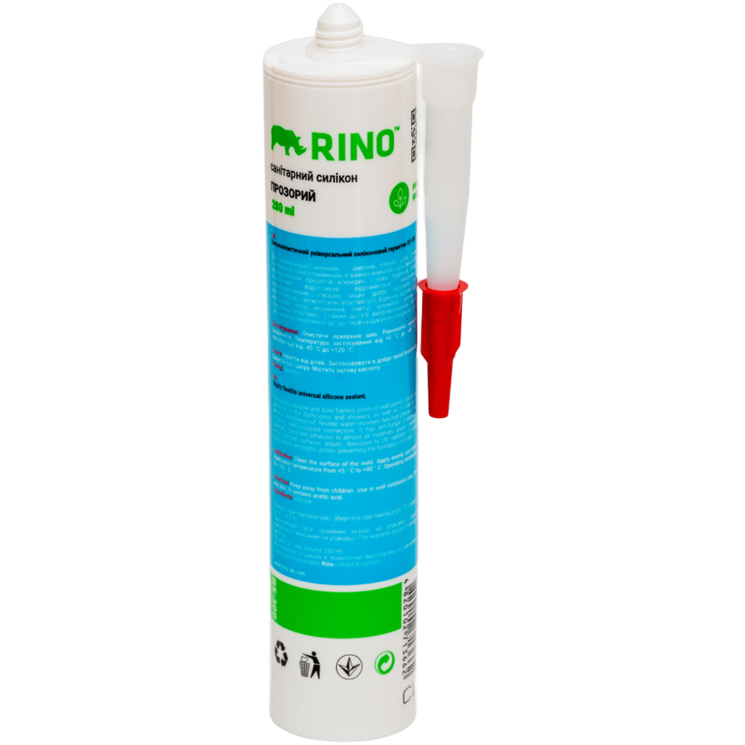Rino SILICONE - санітарний силіконовий герметик. Містить фунгіциди (речовини антисептичної дії, що перешкоджають утворенню цвілі), що дає можливість використовувати його в місцях з підвищеною вологістю. Атмосферостійкий, високоеластичний. Відмінна адгезія практично до всіх матеріалів: скла, керамічній плитці, алюмінію, дереву, пофарбованих поверхонь, пластмасі. Стійкий до УФ випромінюванню, більшості хімічних, чистячих та миючих засобів. Висока еластичність після затвердження. Уповільнює появу грибкової цвілі. Морозостійкість -40°С до + 120°С.