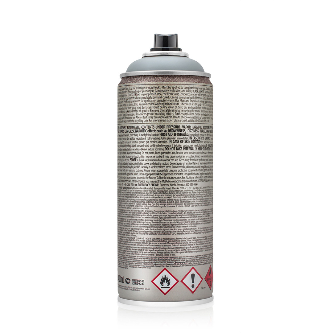 MONTANA CRACKLE EFFECT SPRAY- декоративна обробна аерозольна фарба. Створює на поверхні ефект кракелюра, розтріскування. Фарба наноситься на пофарбовану або грунтовану поверхню. Стійкість фарби до зовнішніх впливів збільшується при покритті шаром безбарвного лаку.