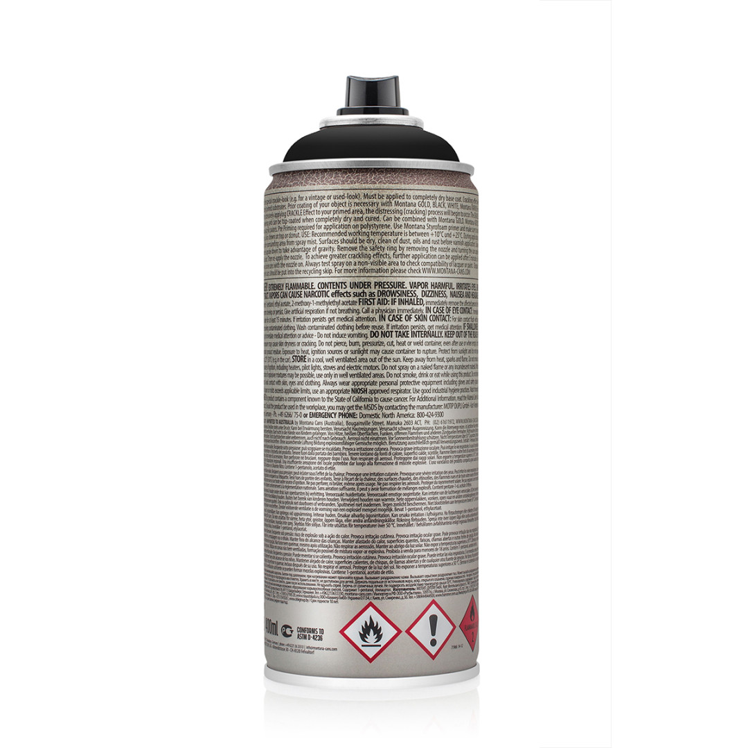 MONTANA CRACKLE EFFECT SPRAY- декоративна обробна аерозольна фарба. Створює на поверхні ефект кракелюра, розтріскування. Фарба наноситься на пофарбовану або грунтовану поверхню. Стійкість фарби до зовнішніх впливів збільшується при покритті шаром безбарвного лаку.