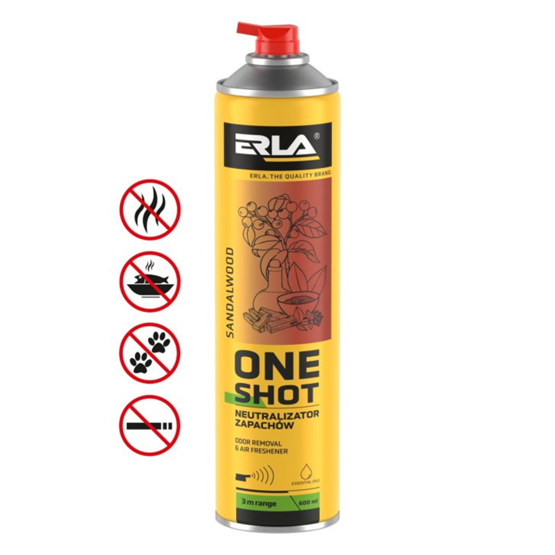 Нейтралізатор запаху та освіжувач повітря ONE SHOT ERLA - не маскує, а усуває частинки неприємних запахів. Чудово справляється з неприємним запахом сечі, гару, сигаретного диму, затхлості або поту. Спеціальний аплікатор забезпечує діапазон нанесення 3 м, завдяки чому продукт ідеально підходить для великих приміщень. Не містить важких металів і фреонів, які пошкоджують озоновий шар. Запах хлопок.