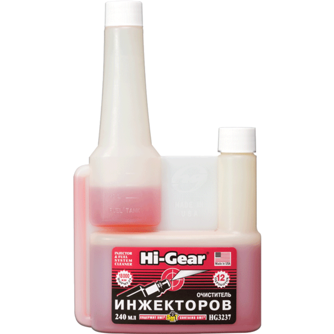 Очисник інжектора з SMT2 Hi-Gear ─ бореться за чистоту паливної конструкції і інжектора, містить антифрикційний складу SMT2 (металевий кондиціонер синтетичного виробництва), що продовжує термін експлуатації двигуна. Продукт полегшує старт двигуна, прибирає відкладення вуглецю, тим самим підвищуючи потужність мотора навіть після заливки бензину відповідає вимогам якості. Очищує паливну систему і інжектори від вуглецевих відкладень. Забезпечує легкий старт. Захищає елементи рухомого типу від зношування.