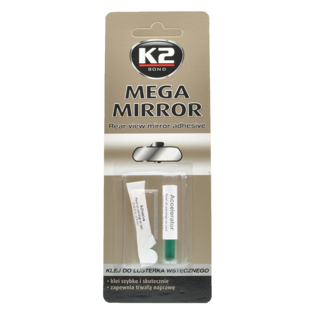Клей для дзеркал заднього виду Mega Mirror К2 ─ швидкодіюче, ефективне і надійне для склеювання дзеркал. Час впливу становить одну хвилину. Припустимо склеювання біжутерії, металу з металом, кераміки, скла зі склом та іншого.