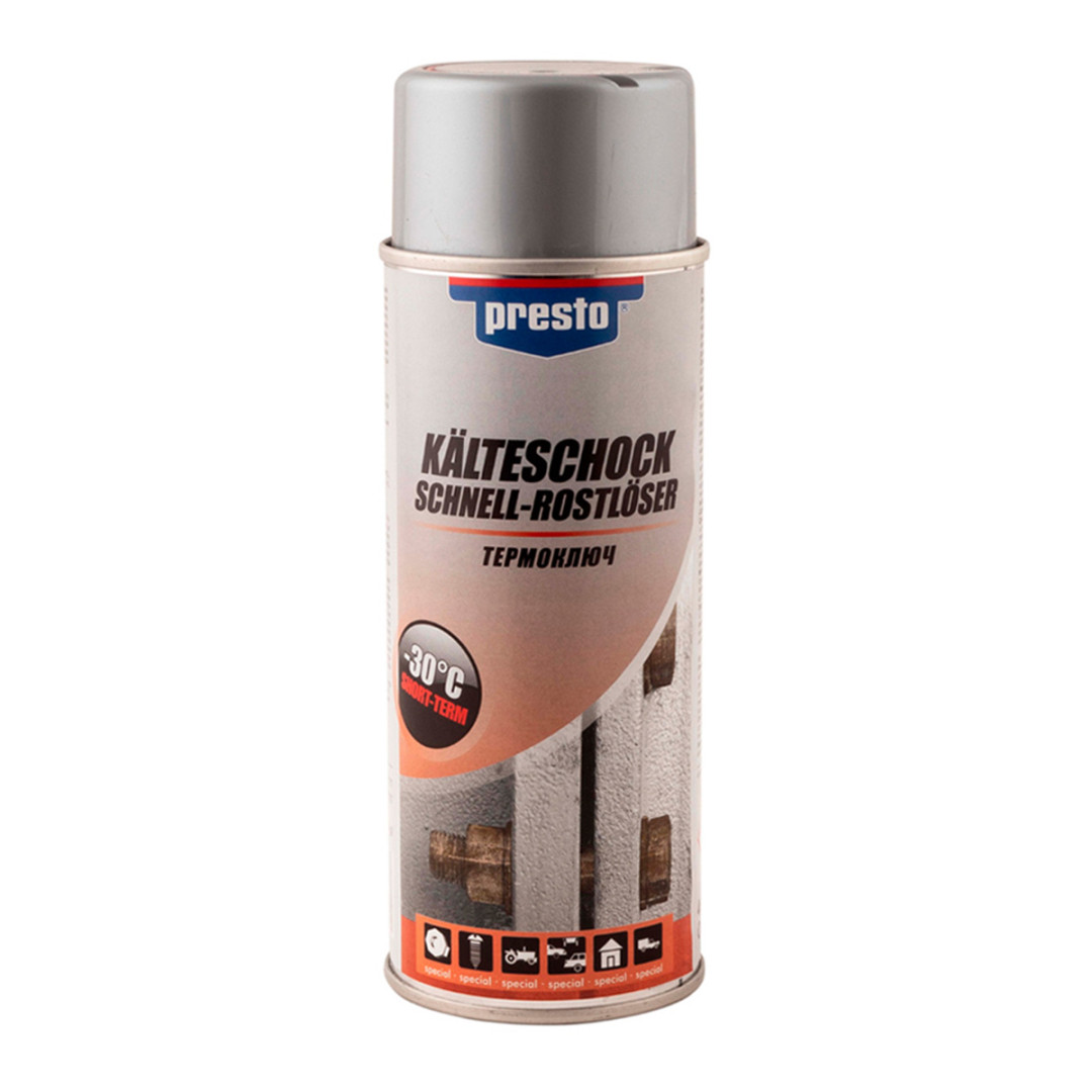 PRESTO термоключ - засіб на основі мінерального масла для відгвинчування заржавілих різьбових з'єднань. Сприяє видаленню іржі, зупиняє і запобігає процес корозії. Діє миттєво. Не містить силікон. Руйнує корозію за рахунок різкого короткочасного зниження температури оброблюваної поверхні до -30 ° С, викликаючи усадкову деформацію і одночасно просочуючи з'єднання маслом.