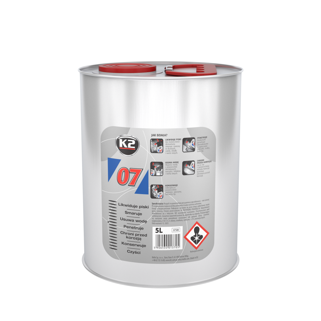 Мастило універсальне 07 К2 ─ ефективний багатофункціональний засіб, містить одночасно 7 синтетичних активних речовин. Не залишає після застосування липких і жирних плям на оброблених деталях. Звільняє від іржі складники механізмів. Знімає блокаду прикипілих болтів, коліс тощо. Ліквідує писк і скрегіт. Витісняє вологу, надає гідрофобні характеристики обробленим поверхням (відмінно висушує дроти запалювання й захищає їх від вологості). Запобігає корозії й не втрачає унікальних особливостей навіть у найекстремальніших ситуаціях. Легко усуває жир, залишки клею й бітум. Має приємний аромат. Може використовуватися з промисловою та домашньою метою.