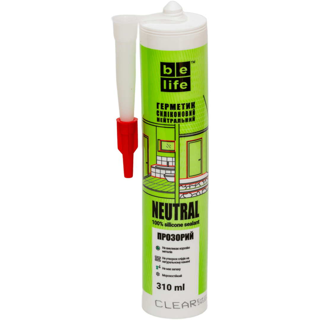 BeLife SILICONE NEUTRAL - високоеластичний однокомпонентний силіконовий герметик нейтрального типу. Екологічно безпечний продукт. Володіє винятковою стійкістю до атмосферних явищ, ультрафіолетового випромінювання та інтенсивному стиранню. Має високу адгезію до бетону, цегли, скла, кераміки, дерева, металу. Не викликає корозію металів. Висока еластичність після затвердження. Не реагує на вплив перепадів температур та зміни вологості. Висока морозостійкість -50°С до + 120°С. Для ручного або пневматичного монтажного пістолету. Для герметизації віконних та дверних блоків, для швів та примикань в ванних кімнатах та душових кабінах, для систем кондиціонування повітря, для облицювальних покритів всередині та зовні будинків, для кухонних раковин та стільниць з різних матеріалів, для заповнення швів в перегородках, навісів з полікарбонатних, та поліакрилових плит, для швів склопакетів.