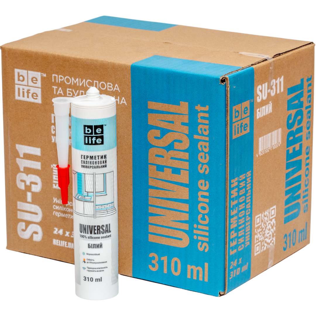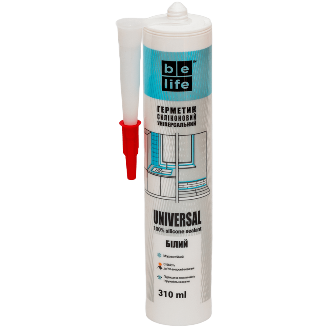BeLife SILICONE UNIVERSAL - високоеластичний однокомпонентний універсальний силіконовий герметик кислотного типу (має характерний запах оцту під час полімеризації). Має високу адгезію до бетону, цегли, скла, кераміки, дерева, металу, має стабільний колір. Стійкий до інтенсивного стирання та УФ-променів. Висока еластичність після затвердіння. Стійкий до більшості хімічних, чистячих та миючих засобів. Морозостійкість -50°С до + 120°С. Для герметизації віконних та дверних блоків, для швів та примикань в ванних кімнатах та душових кабінах, для систем кондиціонування повітря, для облицювальних покритів всередині та зовні будинків.