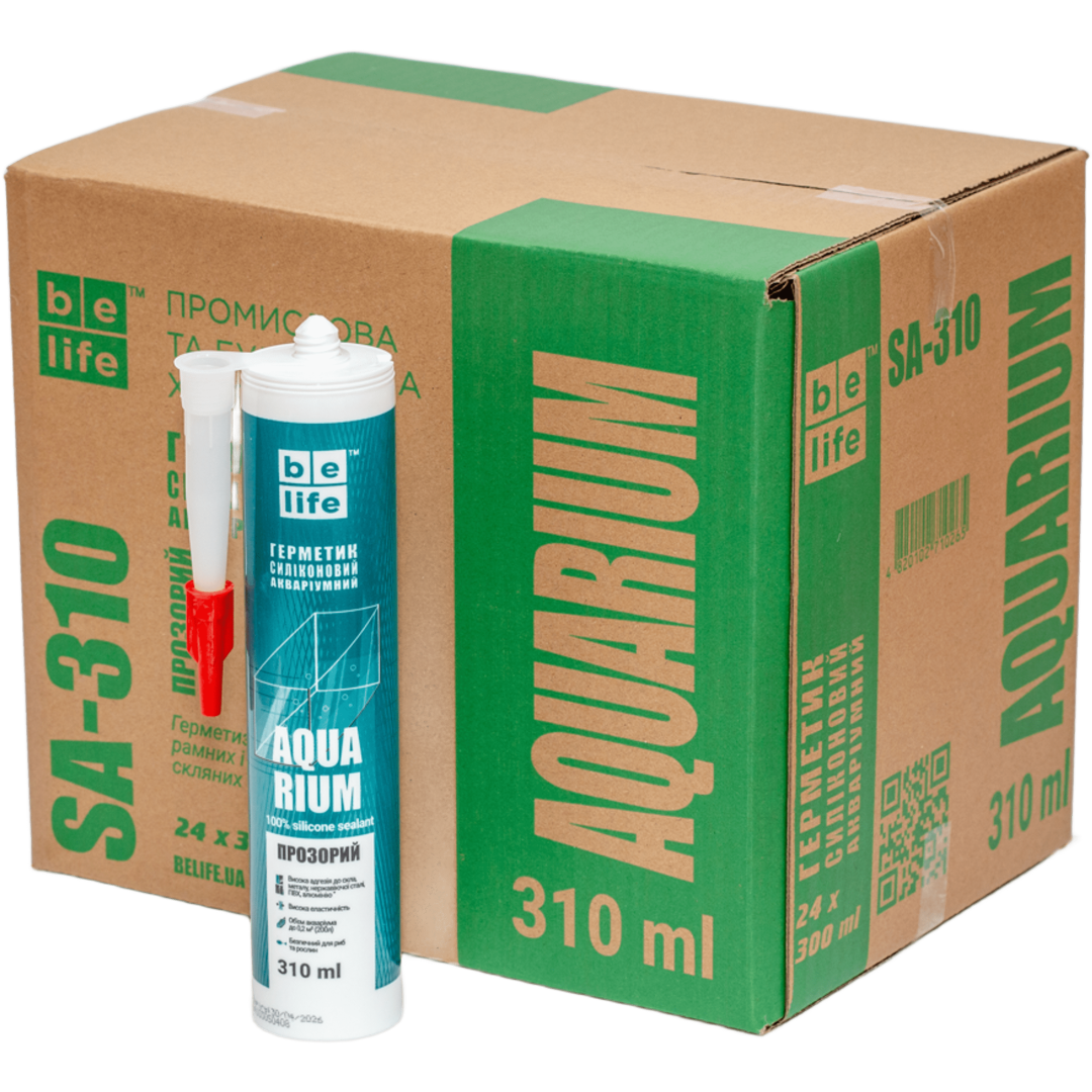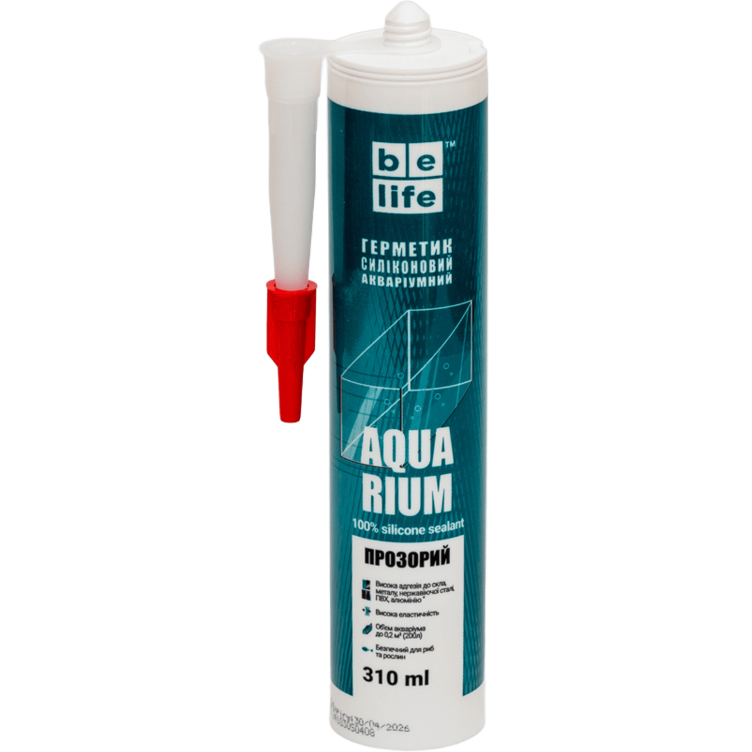 BeLife Aqua Silicone (Акваріумний) - еластичний високоякісний однокомпонентний силіконовий герметик. Розроблений для виконання робіт із збирання та герметизації акваріумів, тераріумів і інших скляних конструкцій. Не токсичний для акваріумних риб і рослин. Відмінна адгезія до скла, кераміки, алюмінію, дереву, ПВХ, пластмасі. Стійкий до УФ випромінюванню, більшості хімічних, чистячих та миючих засобів. Висока еластичність після затвердження. Морозостійкість -70°С до + 180°С. Для акваріумів, для приміщень з підвищенною вологістю, для герметизації санвузлів, басейнів, для швів та примикань в ванних кімнатах та душових кабінах, для систем кондиціонування повітря, для кухонних раковин та стільниць з різних матеріалів, для гідроізоляції поверхонь, для швів між плитками.