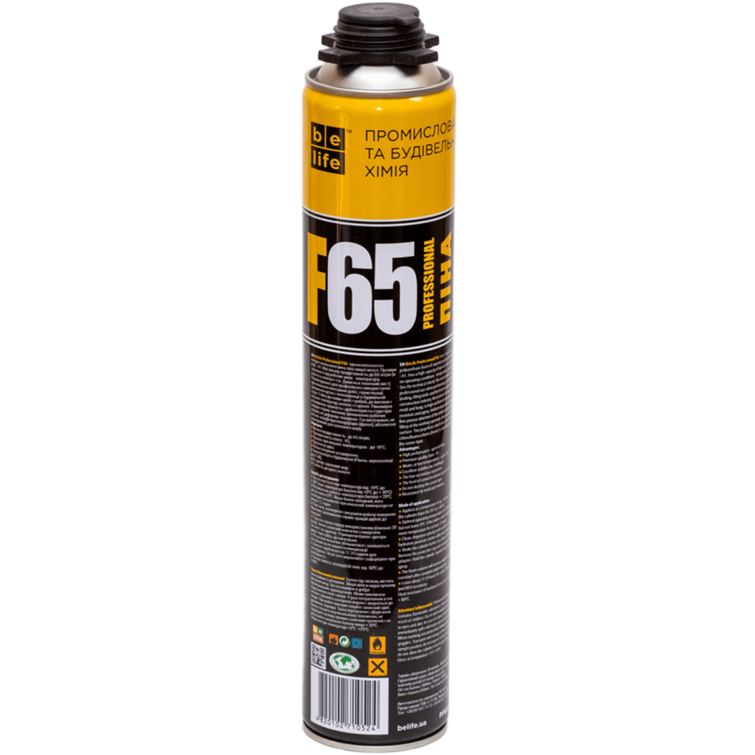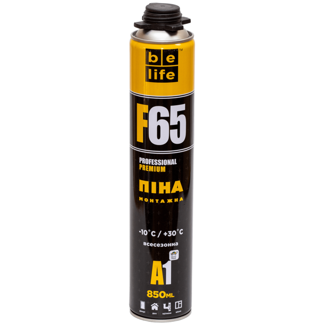BeLife PRO-F65 – професійна монтажна піна із збільшеним виходом (максимальний об'єм до 65 літрів піни на виході). Можна працювати з монтажною взимку піною при температурі до -10°С. Відрізняється великою продуктивністю: вихід із одного балона – до 65 літрів. Має низьке вторинне розширення. Має щільну структуру. Відрізняється хорошими тепло- та звукоізоляційними властивостями.