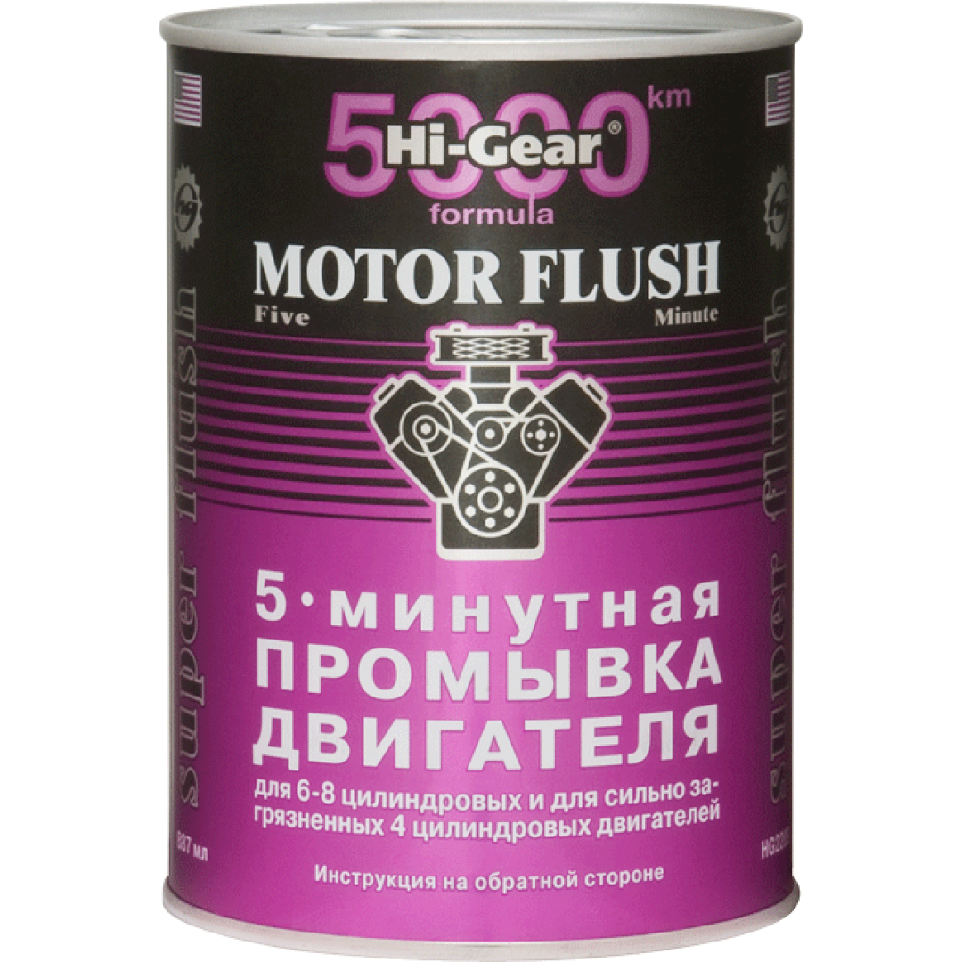 Промивання двигуна 5-хвилинна для 6-8 циліндрових двигунів і сильно забруднених 4-х Hi-Gear - промивання гарантовано видаляє вуглецеві відкладення і продукти розкладання масла з каналів системи змащення, з внутрішніх порожнин і з піддона картера двигуна. Відновлює рухливість поршневих кілець. Покращує відведення тепла. Сприяє тривалому збереженню службових властивостей свіжого масла. Сумісний з усіма типами моторних масел — мінеральними, напівсинтетичними і синтетичними. Безпечна для гумових ущільнювачів, сальников, маслозйомних ковпачків.