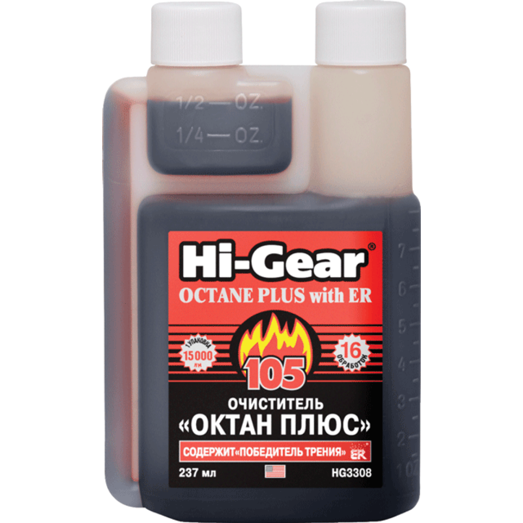 Очисник "Октан-плюс" з ER Hi-Gear - для бензинових (карбюраторних і інжекторних) двигунів. Збільшує октанове число бензину на 5-6 одиниць. Запобігає прогар поршнів та клапанів. Усуває детонацію і краплинне запалювання. Полегшує пуск двигуна. Підвищує потужність двигуна до 20 %. Покращує прийомистість автомобіля. Гарантовано скорочує витрату бензину на 5-7 %.