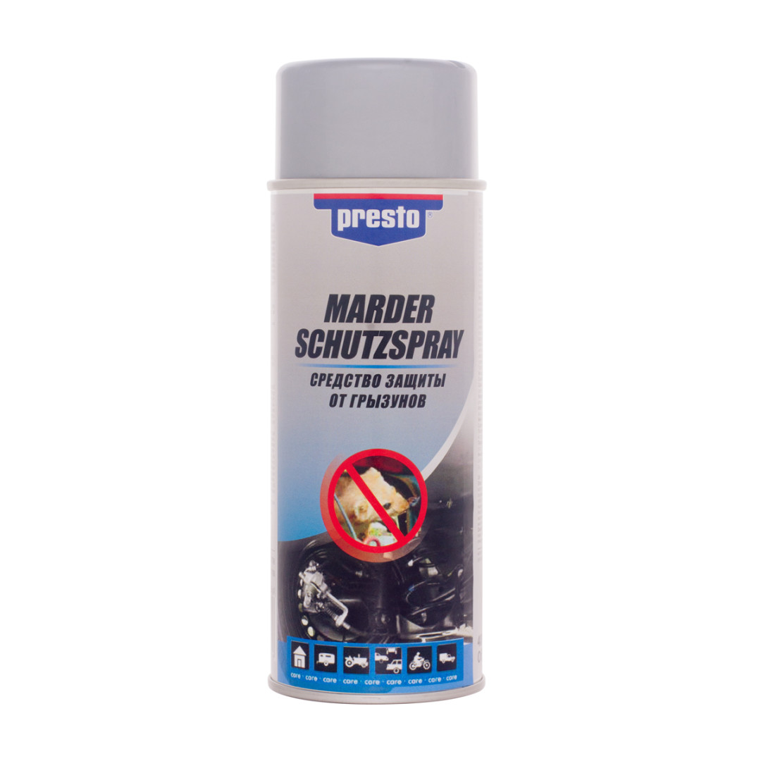 Застосування: струшуйте балон протягом 2 хвилин. Якщо гризуни проникли у двигун, обов'язково вимийте двигун. Якщо обробляєте підкапотний простір, очистьте його очищувачем двигуна Presto. Нанесіть засіб на оброблювані гумові та пластикові деталі, дайте їм висохнути. Для максимального захисту проводьте обробку кожні два місяці.