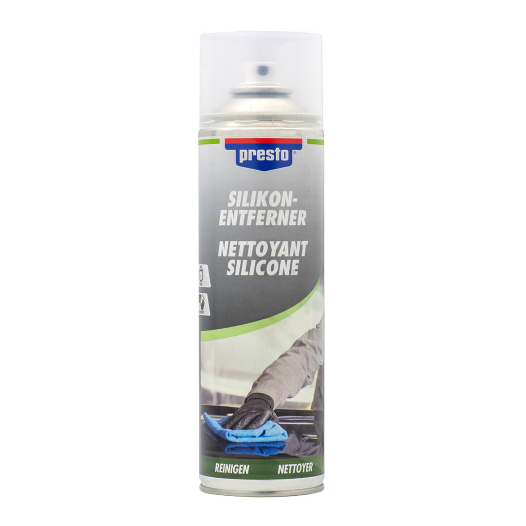 PRESTO видалення силікону - видаляє сліди силікону, липкого шару, плями, що в'їлися. Очищує поверхні від різних забруднень: силікону, жиру, масла, смоли, залишків клею від наклейок, бітуму. Добре підготовляє поверхню перед поліруванням, знежирює. Безпечний для лакофарбового покриття, пластмас, гуми та скла.