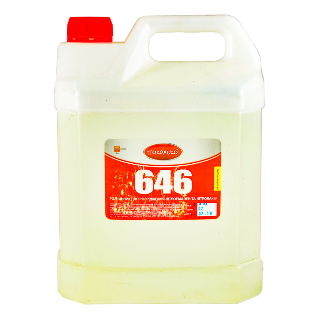 Розчинник Покраско 646 без прекурсорів – багатокомпонентна суміш, до складу якої входять такі продукти нафтопереробки – ацетон, ароматичні вуглеводні, спирти, ефіри. За класифікацією застосування 646 є універсальним розчинником, хоча його основним призначенням є розведення лакофарбової продукції, створеної на нітроцелюлозній основі.