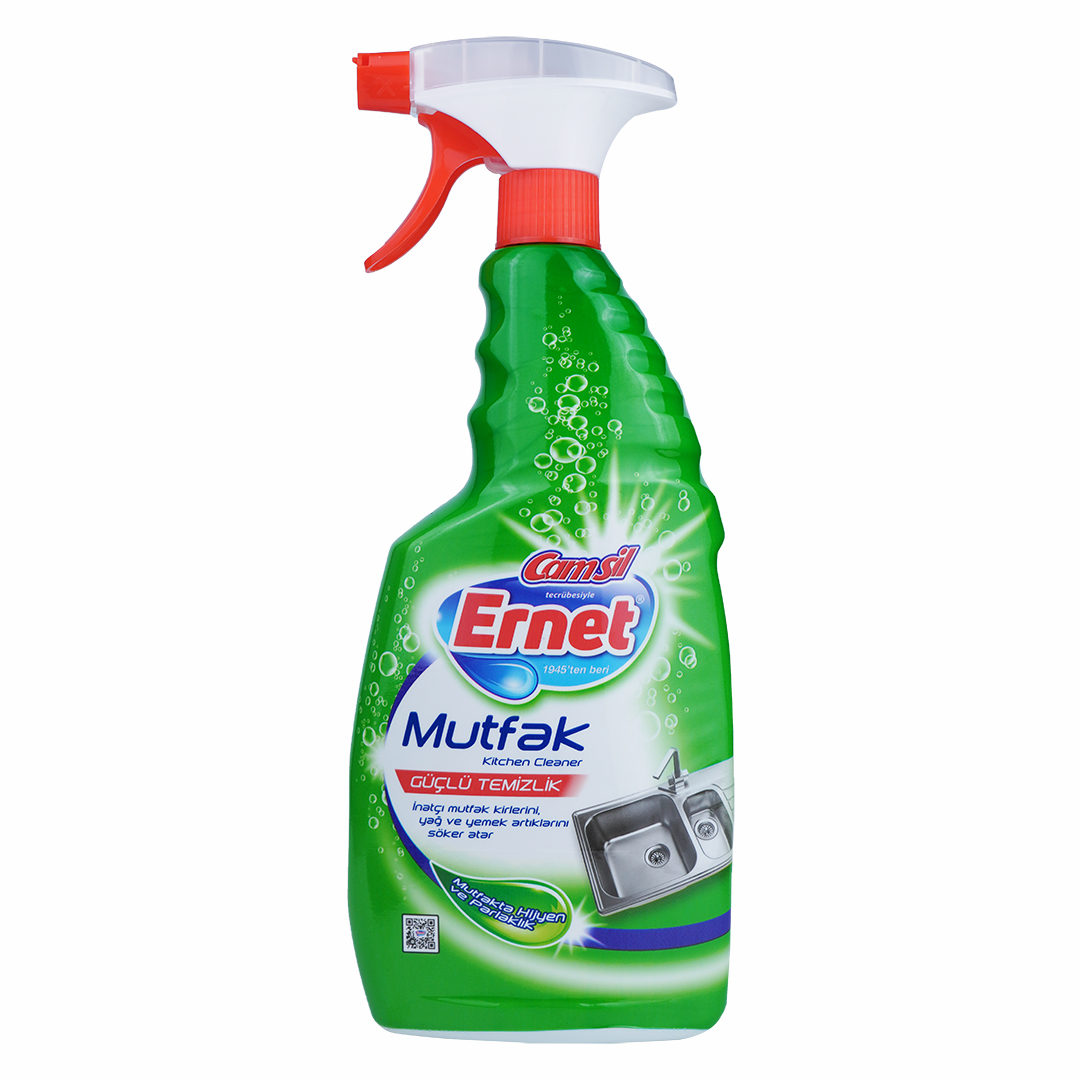 Засіб для чищення кухні Ernet очищає жирові плями та бруд. Змивати засіб не потрібно. Усуває неприємні запахи.