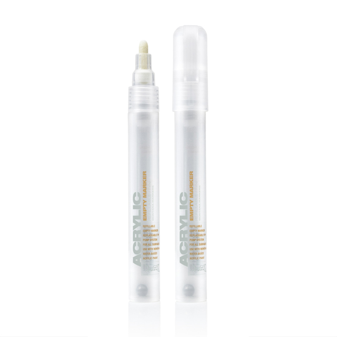 Маркер Montana Acrylic Empry - пустий маркер, який можна заправляти акриловою фарбою Montana Acrylic Refill. Застосовується на твердих (метал, пластик, бетон, скло) і поглинаючих (полотно, папір, тканина, дерево) поверхнях. Прозорі корпуси маркерів дозволяють легко оцінити залишковий вміст маркера. Наконечники для заміни доступні окремо. Для внутрішніх робіт. Водна основа не токсична і не має запаху. Заправлений фарбою Montana Acrylic Paint. Акрилові фарби різних кольорів можна змішувати між собою всередині маркера.