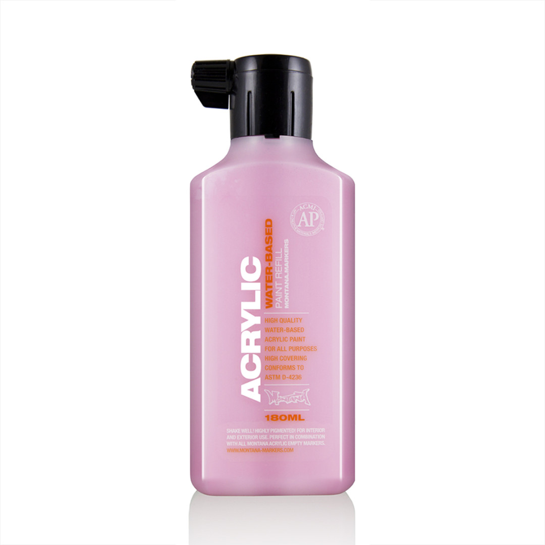 Montana Acrylic Paint Refill – фарба для заправки акрилових маркерів, яка також підходить для сквізерів, аерографів та нанесення пензлем. Високопигментоване акрилове чорнило створює хороше насичене покриття. Швидко сохне, стійко до ультрафіолетового випромінювання та атмосферних впливів. Після повного висихання стає матовою. Кольори можна змішувати між собою. Її можна використовувати разом із відповідними кольорами лінійки Montana аерозолі. Може застосовуватися на будь-яких поверхнях, таких як полотно, дерево, скло, стіни та метал. Як розчинник можна використовувати ацетон.