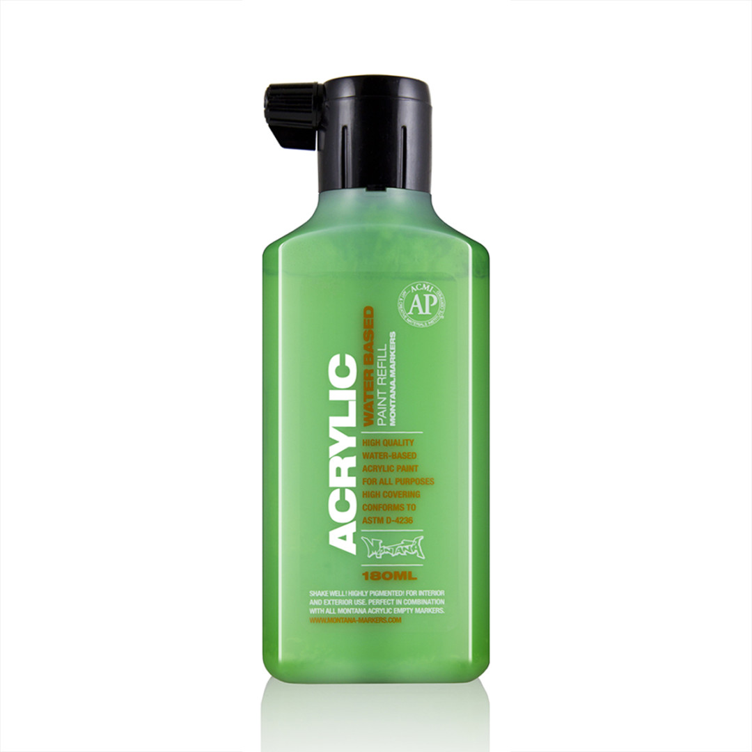 Montana Acrylic Paint Refill – фарба для заправки акрилових маркерів, яка також підходить для сквізерів, аерографів та нанесення пензлем. Високопигментоване акрилове чорнило створює хороше насичене покриття. Швидко сохне, стійко до ультрафіолетового випромінювання та атмосферних впливів. Після повного висихання стає матовою. Кольори можна змішувати між собою. Її можна використовувати разом із відповідними кольорами лінійки Montana аерозолі. Може застосовуватися на будь-яких поверхнях, таких як полотно, дерево, скло, стіни та метал. Як розчинник можна використовувати ацетон.