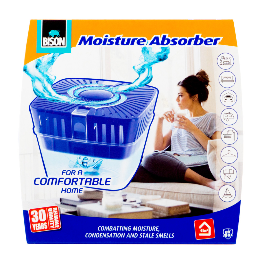Поглинач вологи з наповнювачем Bison знижує рівень конденсату, вологи та застарілих запахів у житлових та нежитлових приміщеннях в будинку та навколо ньогу: сарай, підвал, комора, гараж, а також у трейлерах, причепах, човнах. Бореться та запобігае появі плям від утворення конденсату, затхлого запаху, цвілі, плям від вологи, шкідників і гниття деревини. Вологопоглинач не споживає електроенергі, не шумить та освіжає повітря. Підходить для різних видів наповнювачів: таблеток різної форми та гранул. В комплект входить наповнюч (таблетка) у формі магниту. Для заміни наповнювача, після використання, виробник пропонує наповнювач у вигляді мішечка з ароматизованими гранулами та гранулами без запаху.