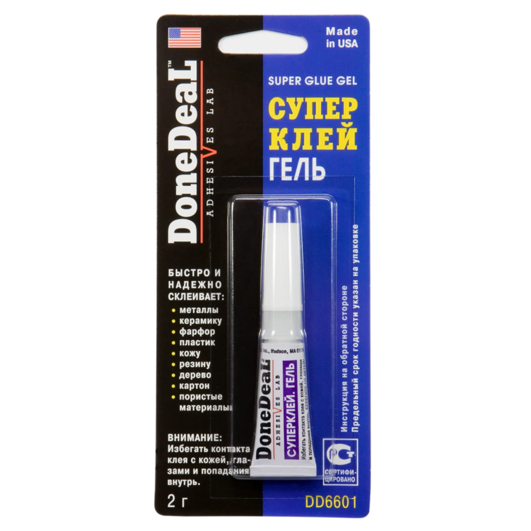 Суперклей Done Deal - ефективний склеювальний засіб, який має гелеподібну консистенцію з низькою плинністю, за рахунок чого його можна використовувати для склеювання вертикальних поверхонь. Засіб склеює металеві, керамічні, пластикові, гумові, пористі деталі, шкіру, картон, дерево та порцеляну. Схоплюється за 15 с, твердне за хвилину, повна полімеризація відбувається за добу. Гель прозорий, простий в експлуатації, стійкий до перепадів температур та дії агресивних технічних рідин.