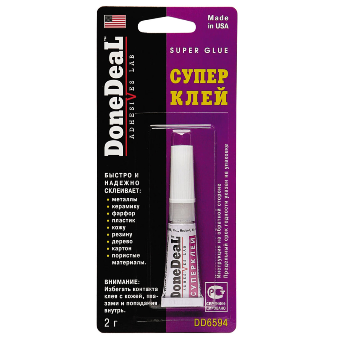 Суперклей Done Deal - ефективний склеювальний засіб, який має гелеподібну консистенцію з низькою плинністю, за рахунок чого його можна використовувати для склеювання вертикальних поверхонь. Засіб склеює металеві, керамічні, пластикові, гумові, пористі деталі, шкіру, картон, дерево та порцеляну. Схоплюється за 15 с, твердне за хвилину, повна полімеризація відбувається за добу. Гель прозорий, простий в експлуатації, стійкий до перепадів температур та дії агресивних технічних рідин.