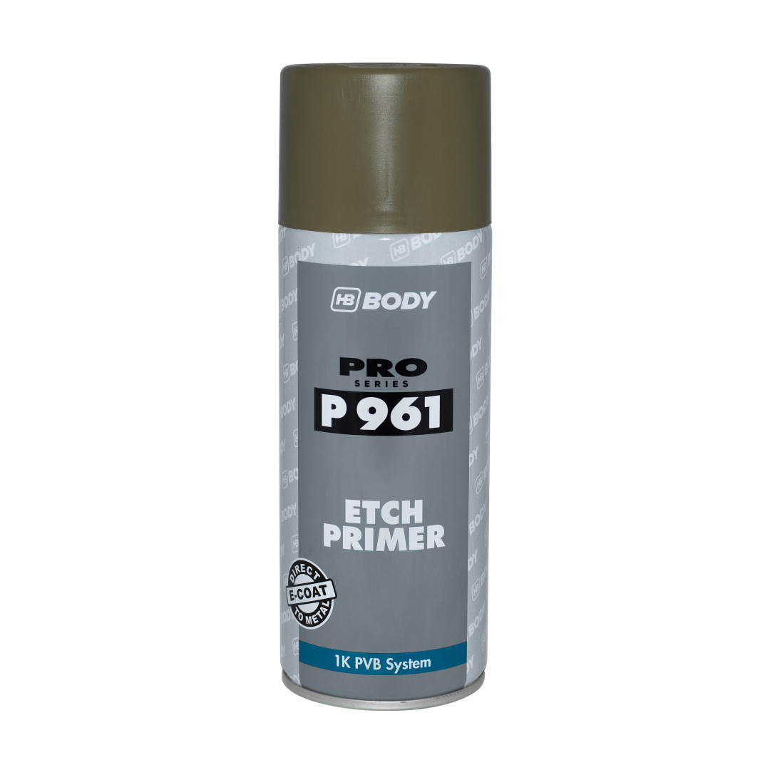 Body P961 Etch Primer - швидкосохнучий антикорозійний протравлюючий грунт. Підходить для нанесення на будь-які металеві поверхні: сталь, оцинкована сталь, нержавіюча сталь, алюміній та інші. Аерозольний однокомпонентний (1K) грунт. Виготовляється на основі полівінілбутиралю «PVB-Система». Фарбується всіма 2К системами грунтовок та будь-яких фінішних покриттів. Питома вага: 0,95 г/см3. Сушіння від пилу 10 хвилин при 23 ºC.