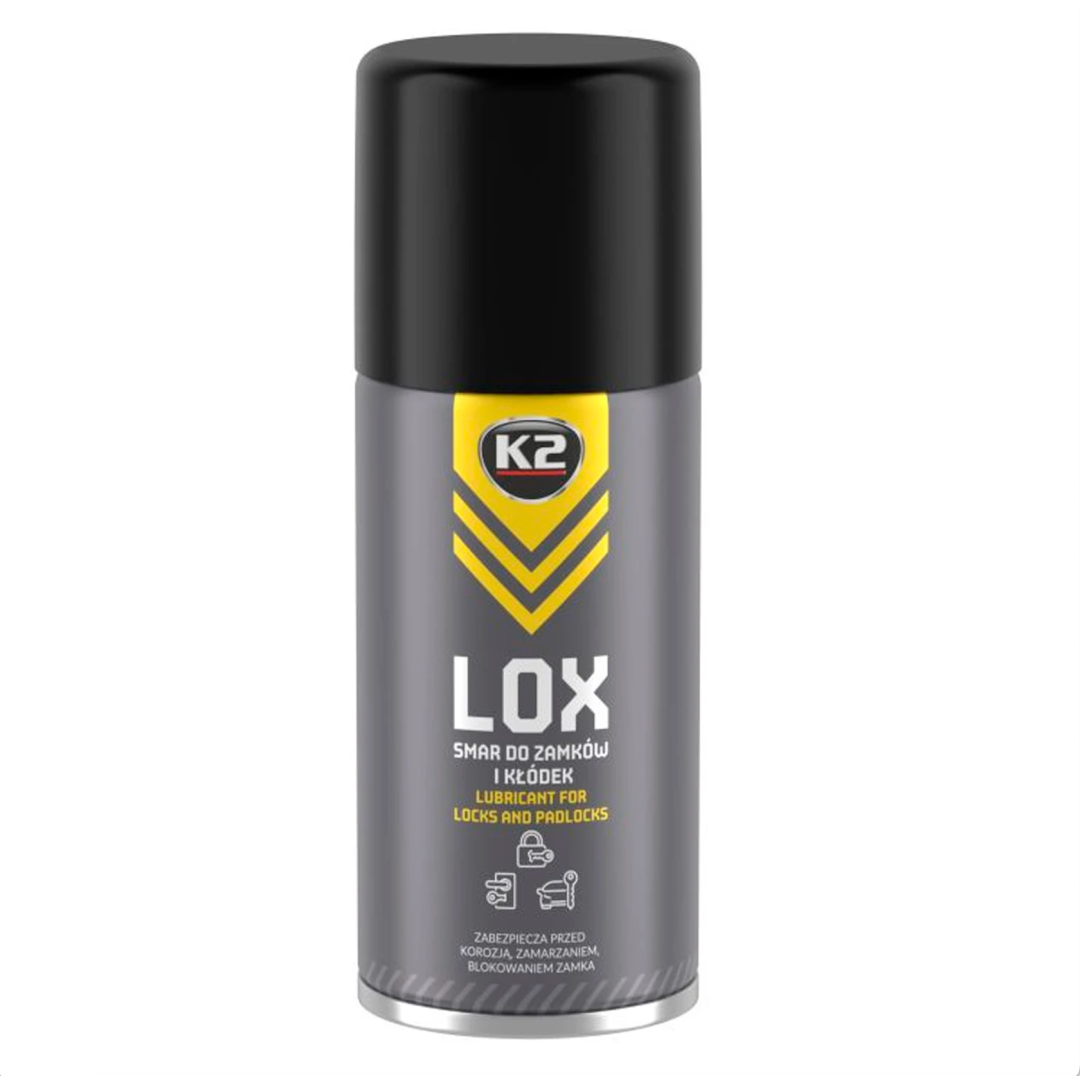 Мастило K2 LOX для обслуговування та захисту всіх типів замків, навісних замків та інших мікромеханізмів, звільнення заклинених механізмів у дверях, воротах, автомобілях, коробках, шафах, велосипедах, внутрішні та зовнішні замки, замки воріт, меблеві замки, засувки та навісні замки, у дверних та окон. Працює в екстремальних умовах від -40 до +200 ° C, захищає від корозії та збільшує термін служби. Швидко випаровується, залишаючи ніжне мастильне покриття.