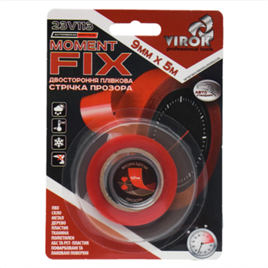 Двостороння стрічка прозора MOMENT Fix оптимальне рішення при необхідності моментального з'єднання поверхонь. Приклеюється моментально і забезпечує максимально міцне довгострокове кріплення. Призначена для з'єднання з максимальним приляганням для ідеально гладких поверхонь. Стрічка взаємодіє з: PET, PP, ABS, PS, ПВХ, хром, метал, скло, пластик, дерево, текстиль.
