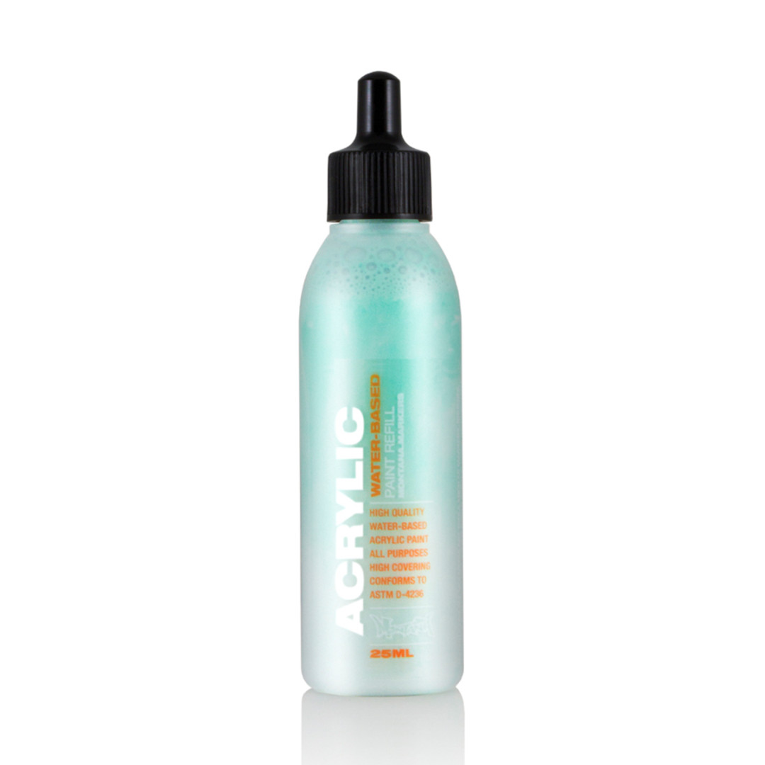 Montana Acrylic Paint Refill – фарба для заправки акрилових маркерів, яка також підходить для сквізерів, аерографів та нанесення пензлем. Високопигментоване акрилове чорнило створює хороше насичене покриття. Швидко сохне, стійко до ультрафіолетового випромінювання та атмосферних впливів. Після повного висихання стає матовою. Кольори можна змішувати між собою. Її можна використовувати разом із відповідними кольорами лінійки Montana аерозолі. Може застосовуватися на будь-яких поверхнях, таких як полотно, дерево, скло, стіни та метал. Як розчинник можна використовувати ацетон.