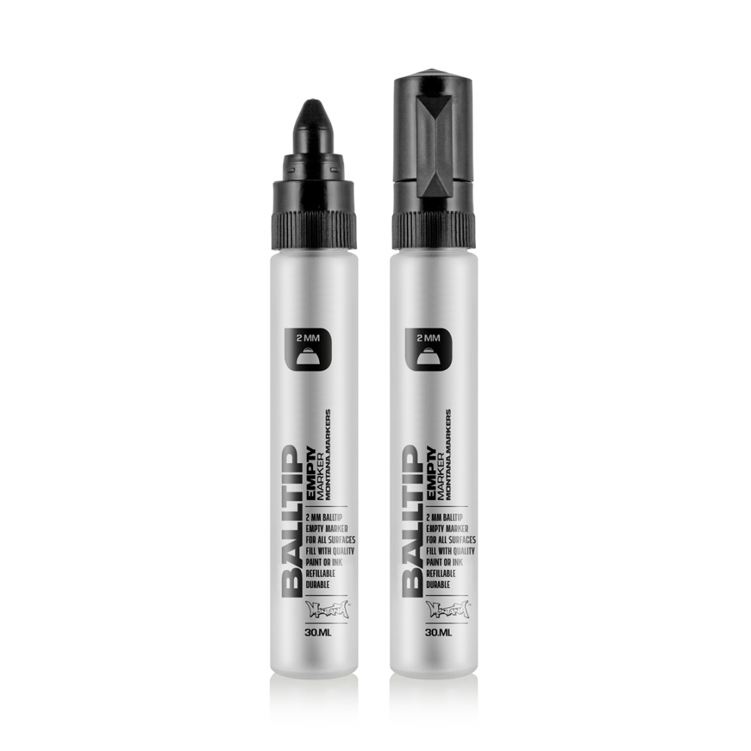 Montana Marker Empry BALLTIP - порожній маркер з 2 мм наконечником у вигляді кулі. Під заправку підійде фарба на акриловій основі чи чорнило на спиртовій основі. У маркері вбудований 2 мм куля наконечник. Оснащений спеціальною оптимізованою клапанною системою подачі чорнила. Маркер багаторазового використання. Завдяки прозорому корпусу рівень заповнення легко контролюється. Можлива заміна пишучого наконечника, а також кульок, що змішують.