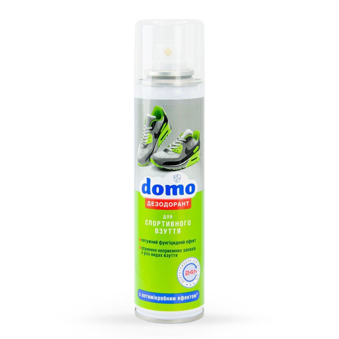 Дезодорант для спортивного взуття Domo для швидкого та надійного дезодорування спортивного взуття. Захищає від неприємних запахів, бактерій та грибків, забезпечуючи свіжість і комфорт. Не містить речовин, які пошкоджують натуральні чи штучні матеріали. Підходить для щоденного використання та сезонного зберігання взуття.