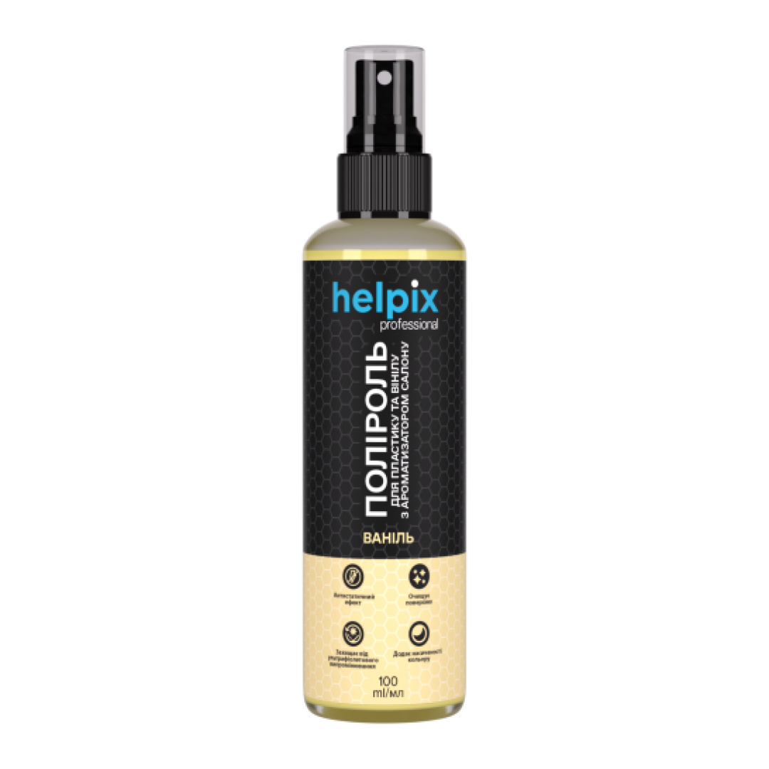 Поліроль для пластику та вінілу Helpix для очищення і захисту панелі приладів, а також усіх деталей з пластику, дерева, гуми і вінілу всередині авто. Відновлює колір, має антистатичний ефект довготривалої дії. Не залишає розводів, глибоко проникає в структуру пластику, перешкоджає розтріскуванню та вигоранню пластику під дією сонячного проміння. Завдяки унікальному складу, що містить віск, засіб надає поверхням глибокий блиск та захищає від ультрафіолетового випромінювання. Утворює на поверхні тонку прозору плівку, що маскує подряпини, відновлює насиченість кольору. Має консервуючий ефект.