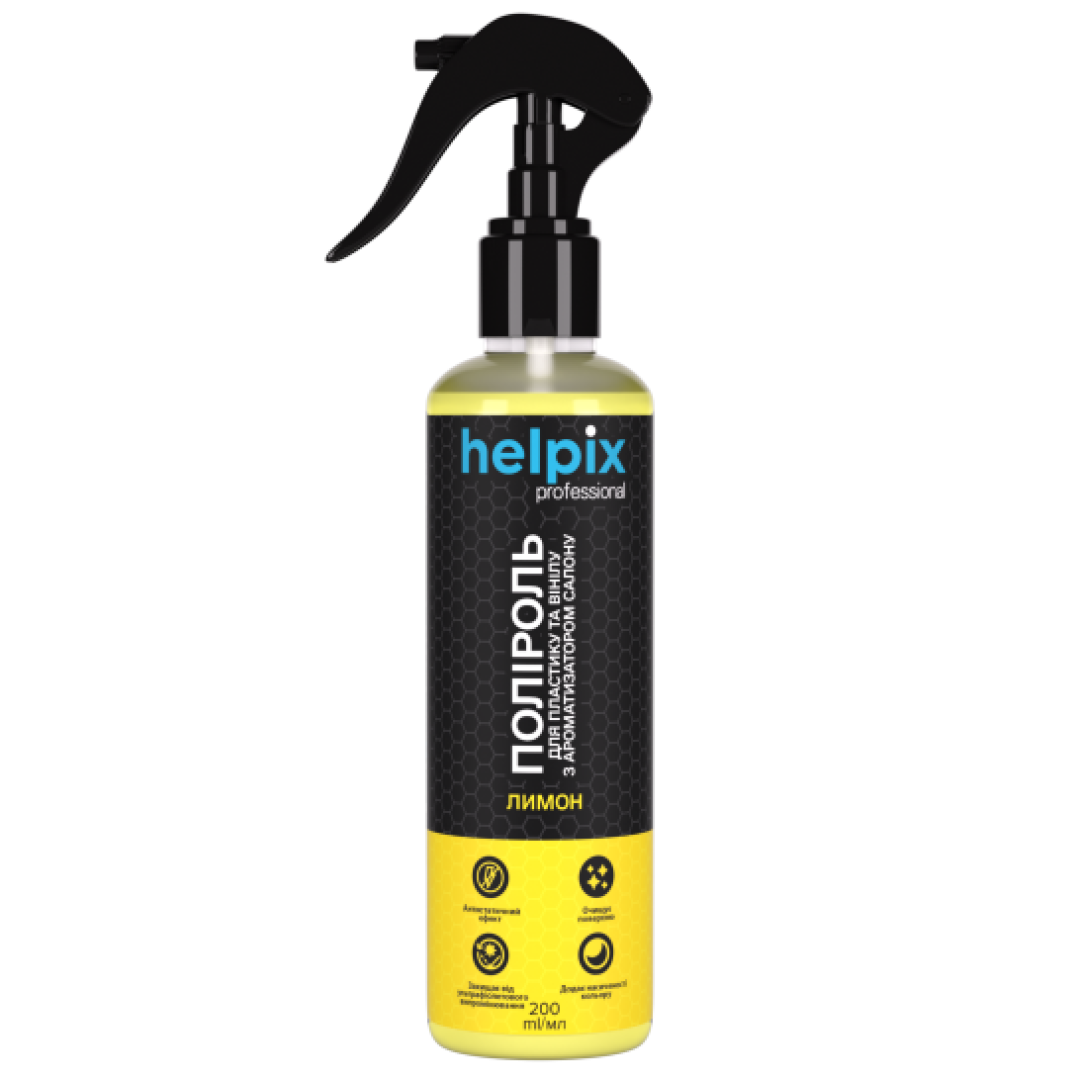 Поліроль для пластику та вінілу Helpix для очищення і захисту панелі приладів, а також усіх деталей з пластику, дерева, гуми і вінілу всередині авто. Відновлює колір, має антистатичний ефект довготривалої дії. Не залишає розводів, глибоко проникає в структуру пластику, перешкоджає розтріскуванню та вигоранню пластику під дією сонячного проміння. Завдяки унікальному складу, що містить віск, засіб надає поверхням глибокий блиск та захищає від ультрафіолетового випромінювання. Утворює на поверхні тонку прозору плівку, що маскує подряпини, відновлює насиченість кольору. Має консервуючий ефект.