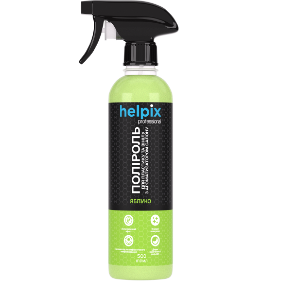 Поліроль для пластику та вінілу Helpix для очищення і захисту панелі приладів, а також усіх деталей з пластику, дерева, гуми і вінілу всередині авто. Відновлює колір, має антистатичний ефект довготривалої дії. Не залишає розводів, глибоко проникає в структуру пластику, перешкоджає розтріскуванню та вигоранню пластику під дією сонячного проміння. Завдяки унікальному складу, що містить віск, засіб надає поверхням глибокий блиск та захищає від ультрафіолетового випромінювання. Утворює на поверхні тонку прозору плівку, що маскує подряпини, відновлює насиченість кольору. Має консервуючий ефект.