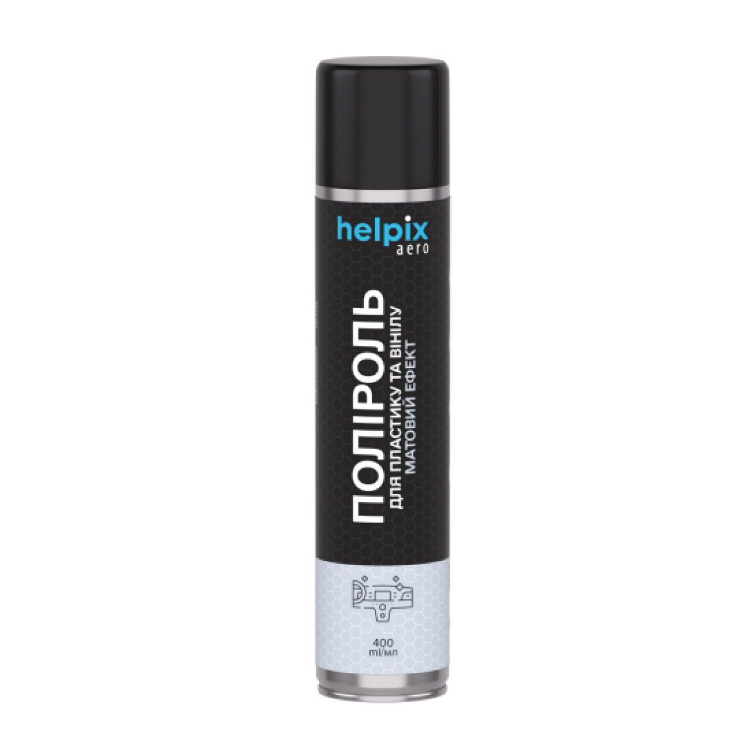 Поліроль для пластику та вінілу Helpix для очищення і захисту панелі приладів з матовим ефектом, а також усіх деталей з пластику, дерева, гуми і вінілу всередині авто. Відновлює колір, має антистатичний ефект довготривалої дії. Не залишає розводів, глибоко проникає в структуру пластику, перешкоджає розтріскуванню та вигоранню пластику під дією сонячного проміння. Завдяки унікальному складу, що містить віск, засіб надає поверхням глибокий блиск та захищає від ультрафіолетового випромінювання. Утворює на поверхні тонку прозору плівку, що маскує подряпини, відновлює насиченість кольору. Має консервуючий ефект.