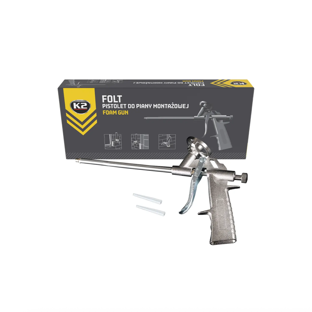 Пістолет для піни K2 FOLT для нанесення будівельної піни. Має стандартне різьблення, що робить його сумісним з усіма видами піни. Є ковпачок для захисту піні. Має плавне та легке регулювання об'єму піни. Виготовлений з міцних матеріалів: алюмінієвий корпус, насадка/ручка зі сталі з покриттям, сталева голка/курок та аплікатор з нержавіючої сталі.