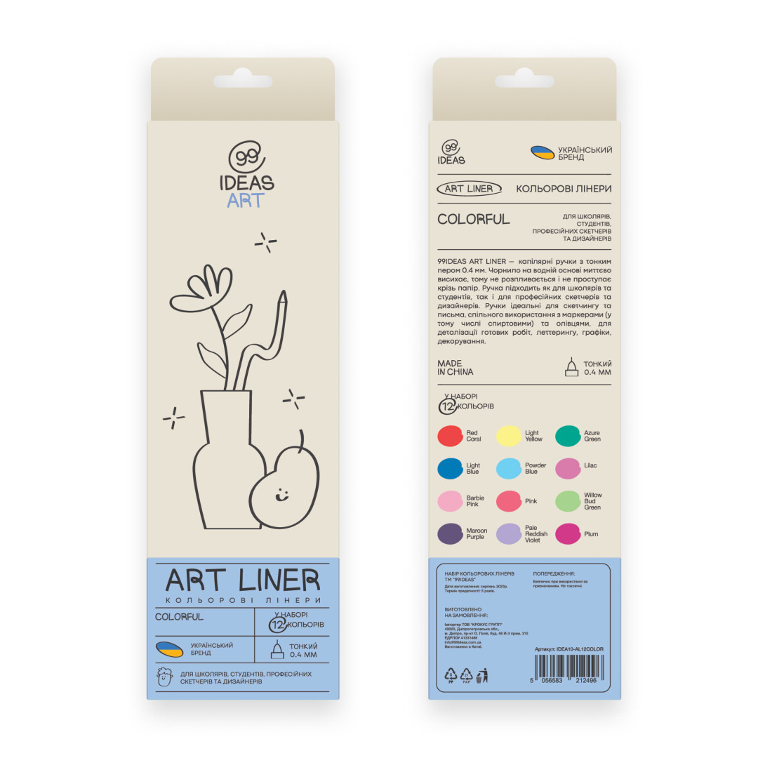 Набір кольорових лінерів 99IDEAS - капілярні ручки з тонким пером 0.4 мм. Чорнило на водній основі миттєво висихає, тому не розпливається і не проступає крізь папір. Ручки тривалий час не висихають без ковпачка.