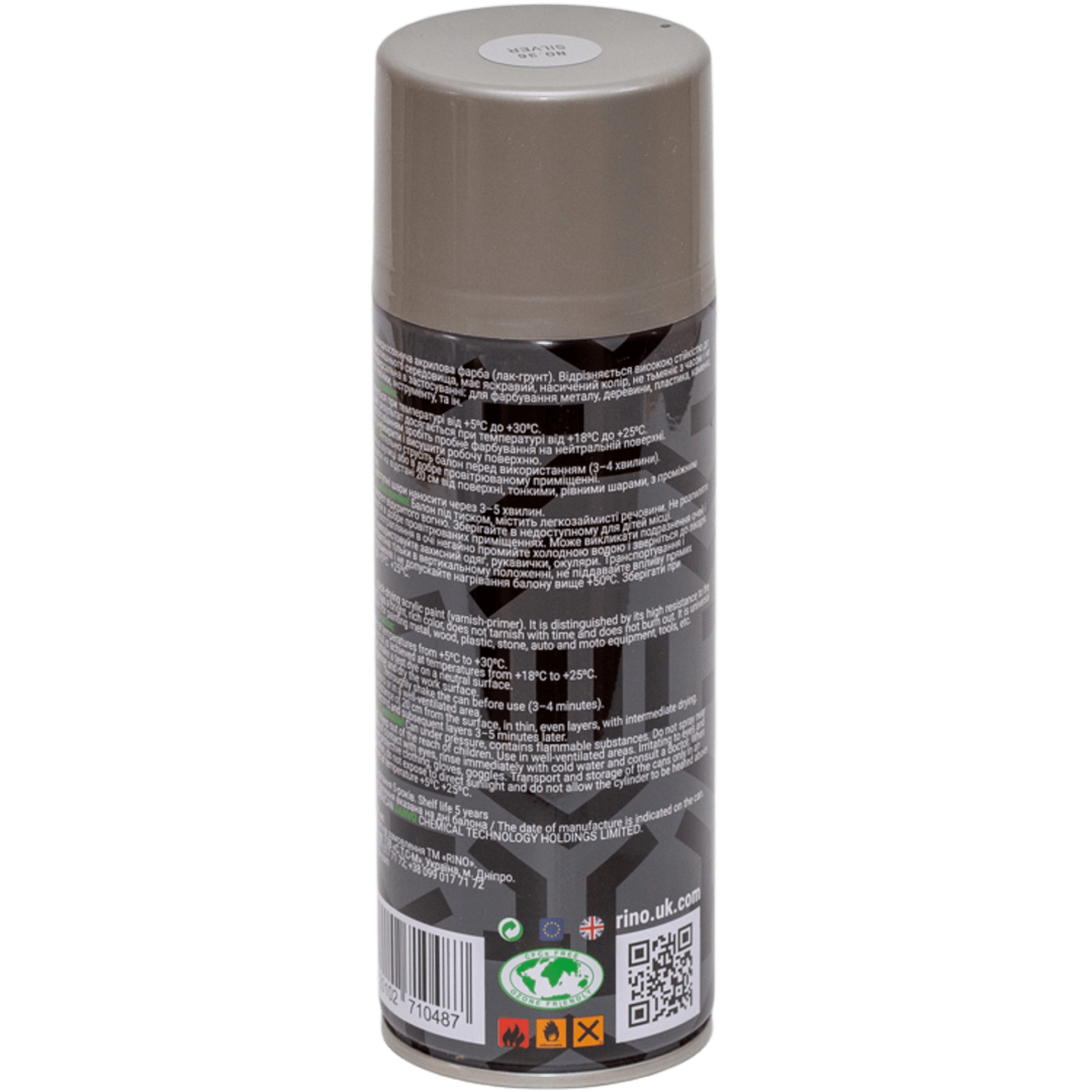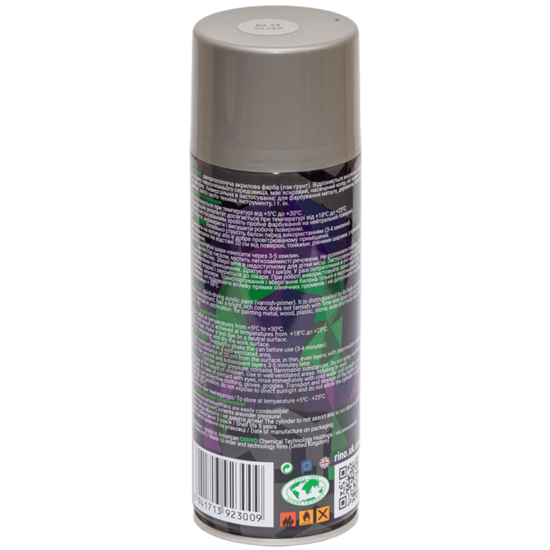 Основні характеристики Універсальна акрилова аерозольна емаль Rino срібло металік (RP-36)