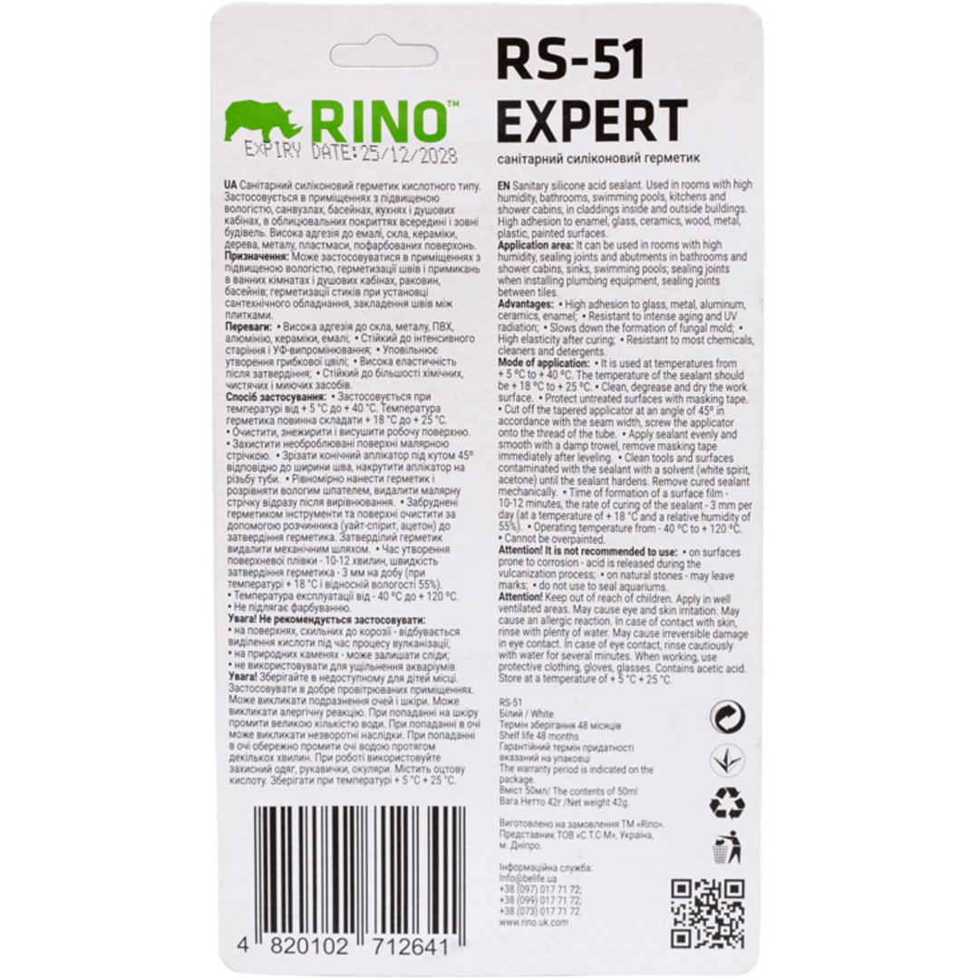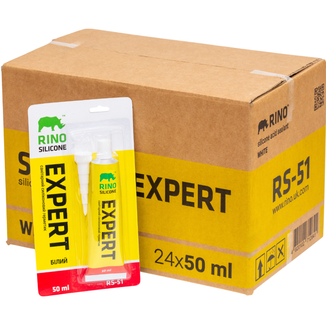 Описание Санитарный силиконовый герметик белый Rino EXPERT RS-51, 50 мл