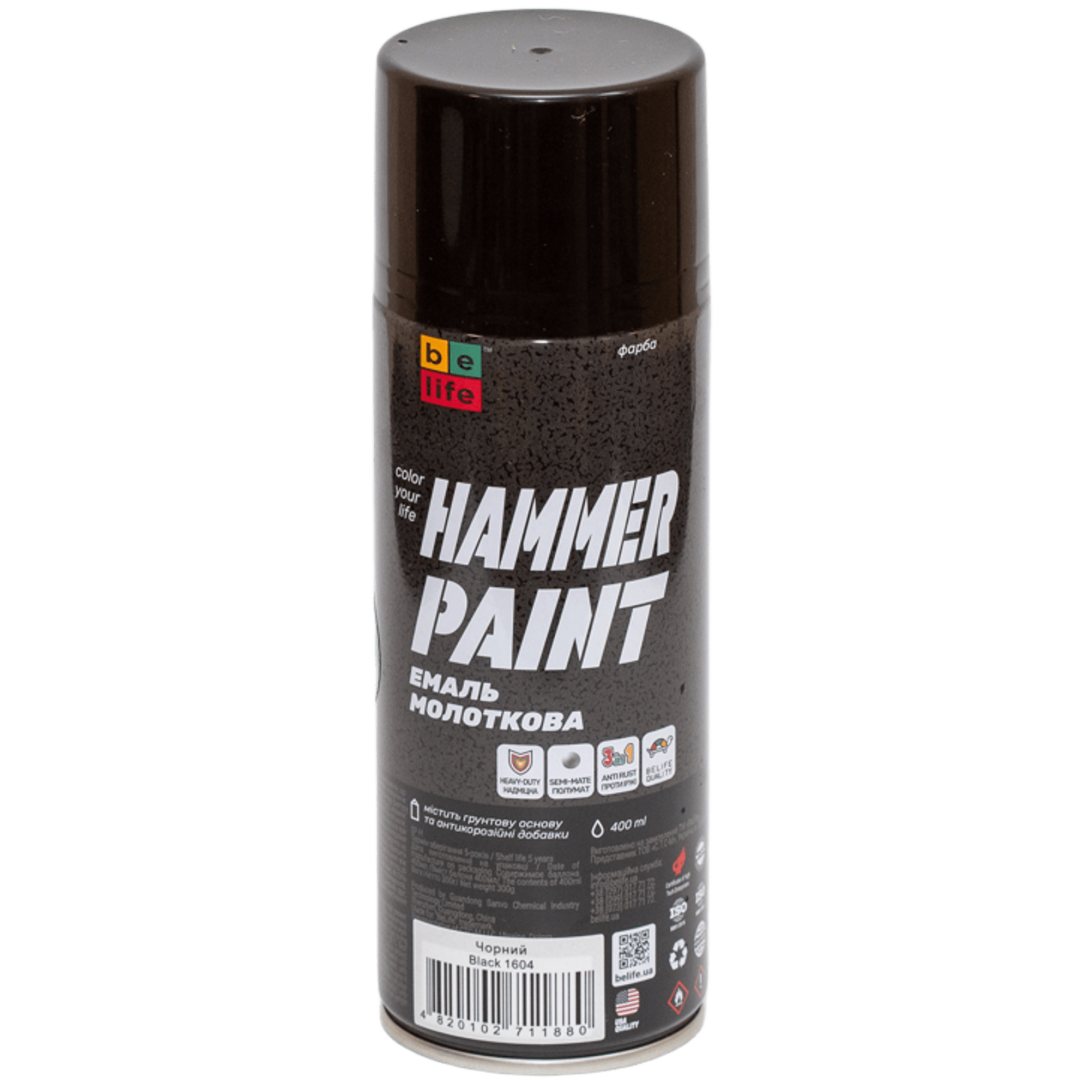 BeLife Spray Paint Hammer – аэрозольная акриловая эмаль с «молотковым» эффектом, для окрашивания поверхностей из черных металлов подверженных коррозии или уже имеющих следы ржавчины. Оказывает декоративный эффект «ручная молотковая чеканка», образуя своеобразный фактурный рисунок. Отлично скрывает неровности металла, дерева. В своем составе содержит алюминиевые хлопья, создающие характерную кружевную фактуру. Можно окрашивать металлоконструкции, трубы, кованые изделия, входные двери, ворота, сейфы.