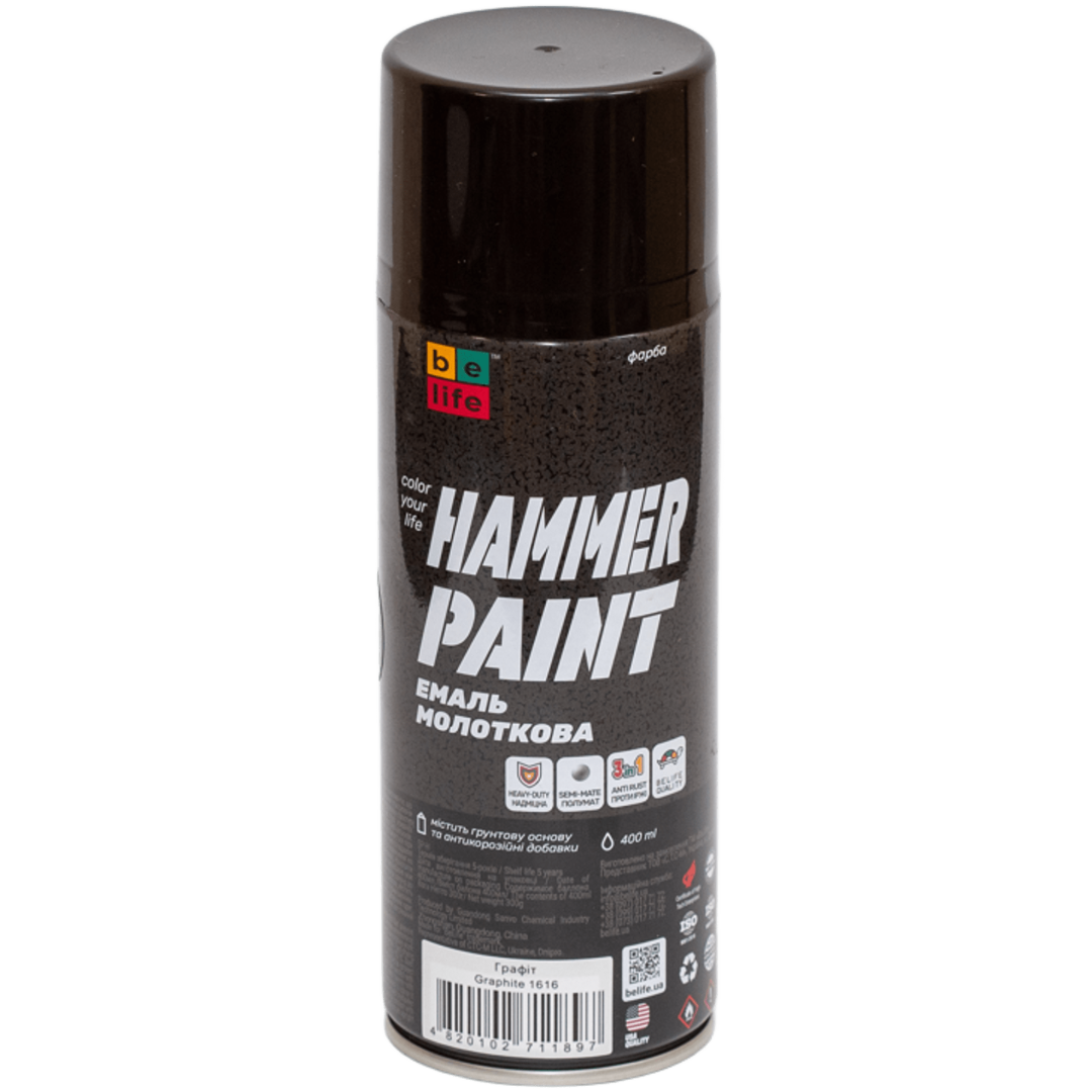 BeLife Spray Paint Hammer – аэрозольная акриловая эмаль с «молотковым» эффектом, для окрашивания поверхностей из черных металлов подверженных коррозии или уже имеющих следы ржавчины. Оказывает декоративный эффект «ручная молотковая чеканка», образуя своеобразный фактурный рисунок. Отлично скрывает неровности металла, дерева. В своем составе содержит алюминиевые хлопья, создающие характерную кружевную фактуру. Можно окрашивать металлоконструкции, трубы, кованые изделия, входные двери, ворота, сейфы.