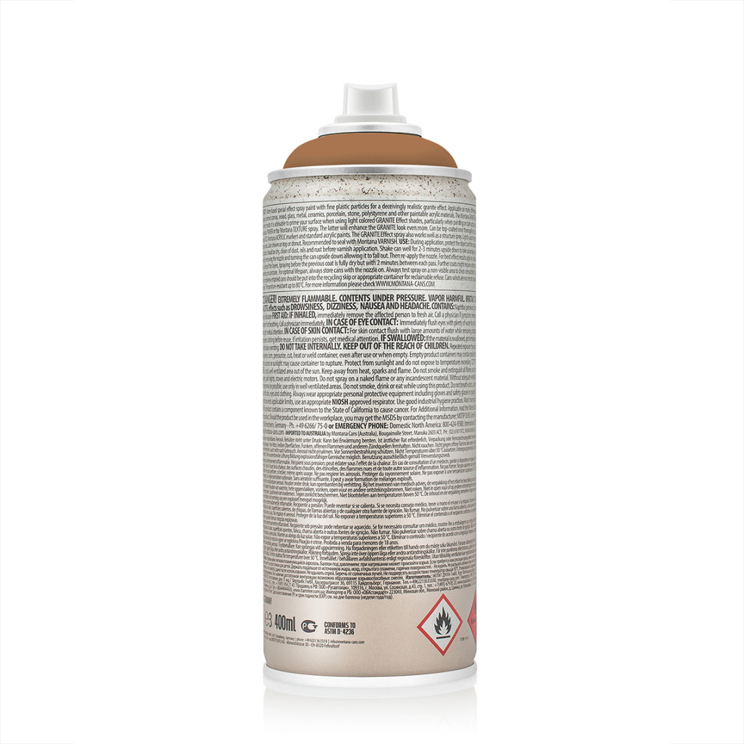 Montana Granit – декоративная отделочная аэрозольная краска на водной основе. Создает по фактуре и цвету эффект гранитной поверхности. Краска может наноситься на разные поверхности и находит свое применение в художественных мастерских, для декоративного окрашивания предметов интерьера и для хобби. Краска наносится на окрашенную или грунтованную поверхность. Устойчивость краски к внешним воздействиям увеличивается при покрытии слоем бесцветного лака.