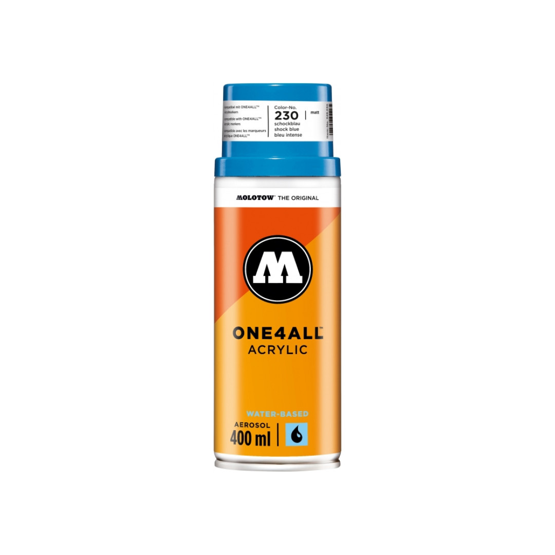 Molotow ONE4AL Acrylic – матовая быстросохнущая акриловая краска на водной основе (85% содержание воды), практически не имеющая запаха. Высокая стойкость к ультрафиолетовому излучению. Можно окрашивать практически любую поверхность. Для внутреннего и наружного применения.