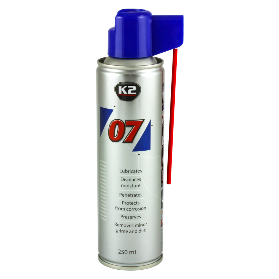 Масло универсальное 07 К2 – эффективное многофункциональное средство, содержащее одновременно 7 синтетических активных веществ. Не оставляет после применения липких и жирных пятен на обработанных деталях. Освобождает от ржавчины составляющие механизмов. Снимает блокаду прикипелых болтов, колес и т.п. Устраняет писк и скрежет. Вытесняет влагу, придает гидрофобные характеристики обработанным поверхностям (отлично высушивает провода зажигания и защищает их от влажности). Предотвращает коррозию и не теряет уникальных особенностей даже в самых экстремальных ситуациях. Легко устраняет жир, остатки клея и битум. Обладает приятным ароматом. Может использоваться в промышленных и домашних целях.