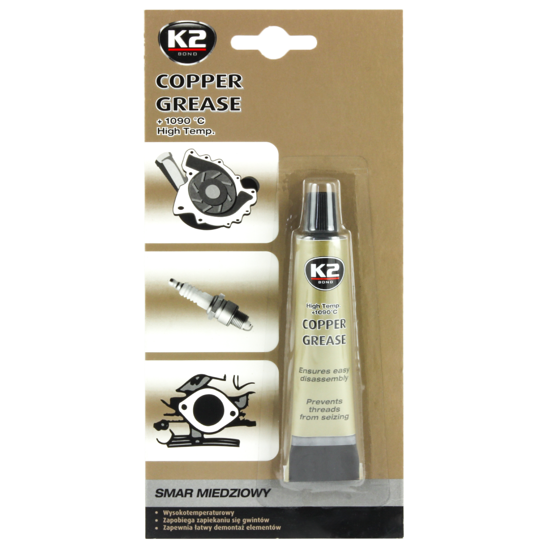 Смазка медная Copper Grease K2 - высокотемпературная медная смазка постоянно защищает металлические поверхности от прикипания и коррозии, обеспечивает их легкий демонтаж. Для касательных деталей, эксплуатируемых в чрезвычайно трудных условиях, например: болты выпускного коллектора, болты головки, болты турбокомпрессора, резьба свечей зажигания, тормозные механизмы.
