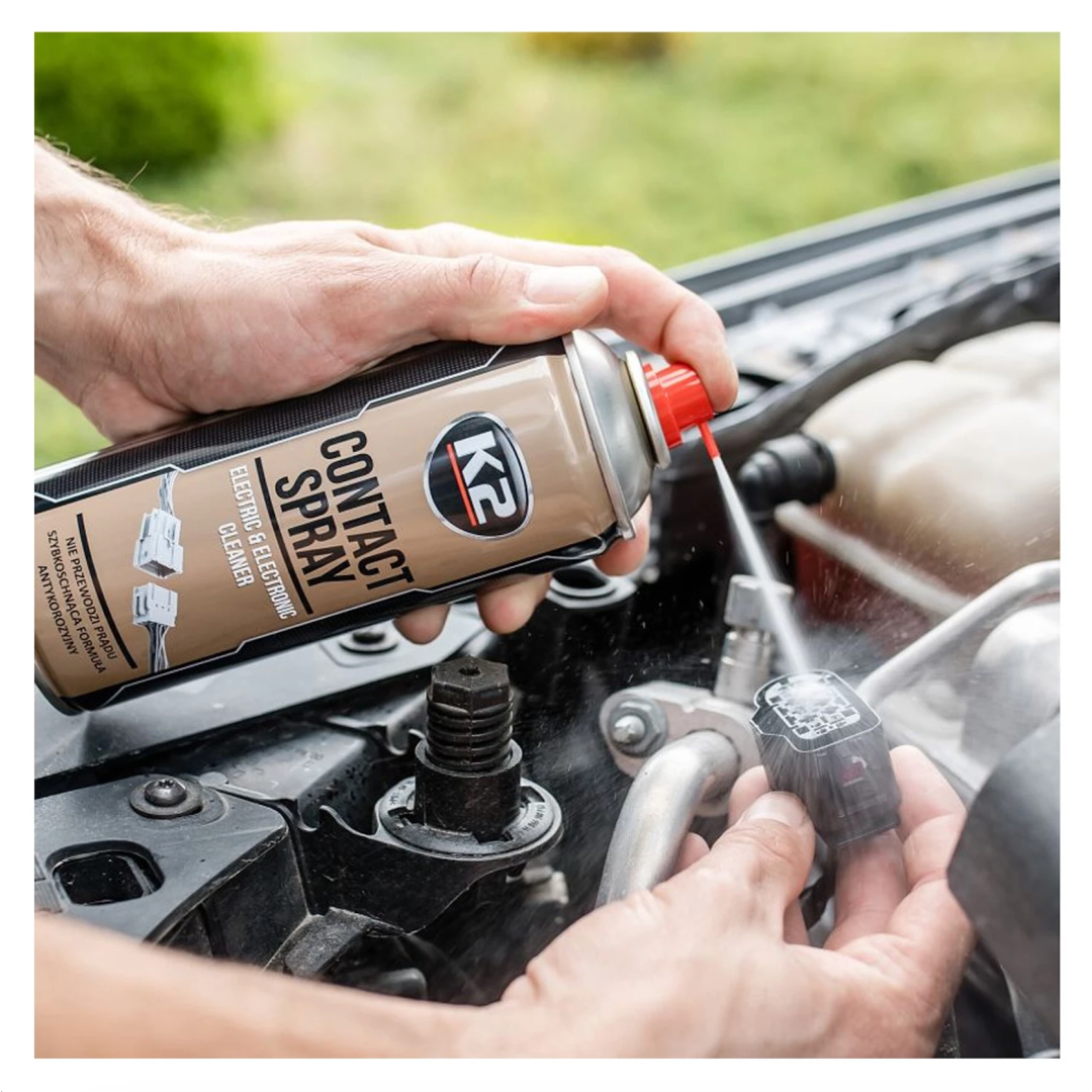 Очиститель контактов Contact Spray К2 – очистной и обезжиривающий состав для электрических элементов: предохранителей, свечей зажигания, выключателей, вилок, контактов и кабелей. Средство защищает от окисления, образования сульфидов. Обладает антикоррозионными свойствами, препятствует скоплению влаги. Облегчает зажигание и предотвращает потерю напряжения. Эффективный продукт для устойчивой работы электрической системы.