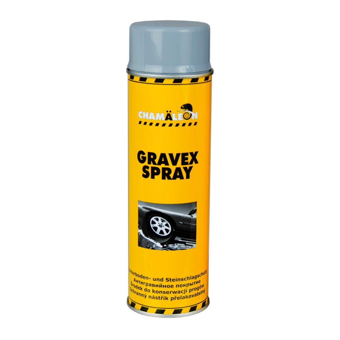 Chamaeleon Gravex Spray – используется для защиты порогов, дверей, колесных арок и других элементов кузова автомобиля от вибрации, песка и гравия, воды и соли. Быстро сохнет при температуре 20 °C и влажности не более 50%. Образует упругое эластичное покрытие. Содержит антикоррозионные добавки. Обладает звукоизолирующими свойствами. Может быть окрашено любыми лакокрасочными материалами.