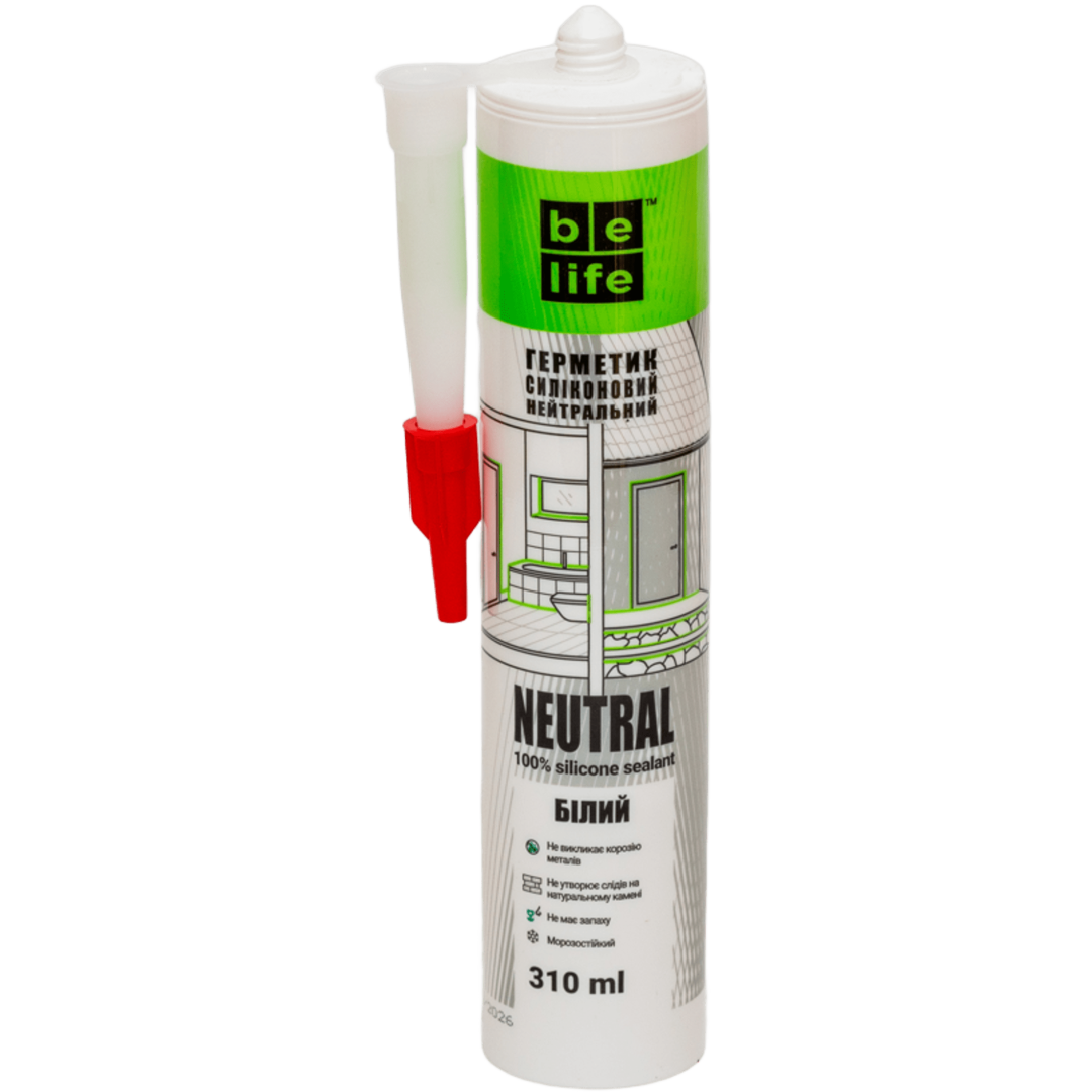 BeLife SILICONE NEUTRAL – высокоэластичный однокомпонентный силиконовый герметик нейтрального типа. Экологически неопасный продукт. Обладает исключительной устойчивостью к атмосферным явлениям, ультрафиолетовому излучению и интенсивному истиранию. Имеет высокую адгезию к бетону, кирпичу, стеклу, керамике, дереву, металлу. Не вызывает коррозию металлов. Высокая упругость после утверждения. Не реагирует на влияние перепадов температуры и изменения влажности. Высокая морозостойкость –50°С до +120°С. Для ручного или пневматического монтажного пистолета. Для герметизации оконных и дверных блоков, для швов и примыканий в ванных комнатах и душевых кабинах, для систем кондиционирования воздуха, для облицовочных покрытий внутри и снаружи домов, для кухонных раковин и столешниц из различных материалов, для заполнения швов в перегородках, навесов из поликарбонат.