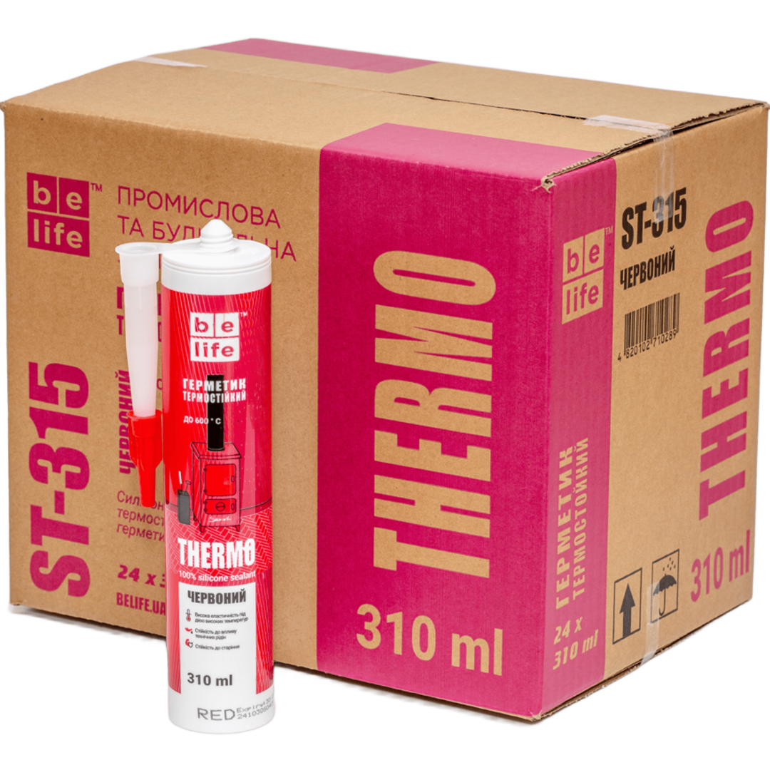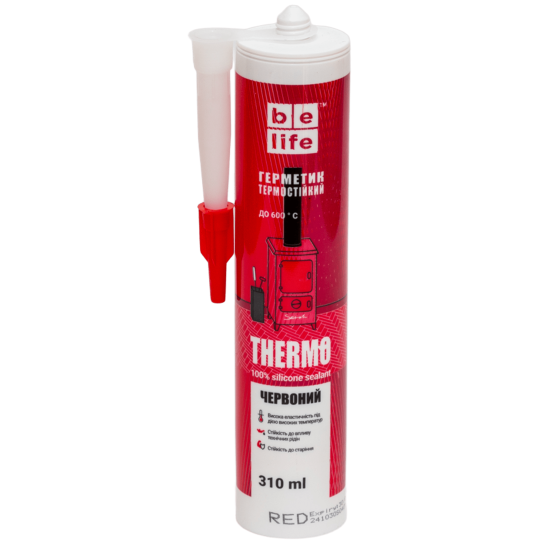 BeLife Termo (термостойкий) – высокоэластичный однокомпонентный силиконовый герметик. Устойчив к воздействию высоких температур (до +600°С) и технических жидкостей (топлива, масел, жиров, воды и морозостойких жидкостей). Атмосферостойкий. Отличная адгезия практически ко всем материалам: стеклу, керамической плитке, алюминию, окрашенным поверхностям. Устойчив к УФ излучению, большинству химических, чистящих и моющих средств. Высокая упругость после утверждения. Термостойкость -40°С до +600°С. Для герметизации, для соединений деталей печей, дымоходов, каминов, систем вентиляции, для заполнения швов духовых шкафов, нагревательных панелей кухонных плит, для силовых установок, двигателей, для приклеивания стекла в местах подверженных повышенной температуре, для образования прокладок в системе отопления.