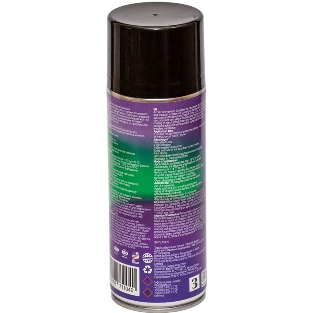 BeLife Tint Varnish - 100% акриловый аэрозольный лак лак для тонирования, обеспечивает прочное окрашиваемое защитное покрытие. Усиливает глубину основного цвета. Обладает улучшенными свойствами защиты от ультрафиолетовых лучей. Характеризуется прекрасной адгезией к любым материалам и быстрым высыханием. Наносится на наружную поверхность.